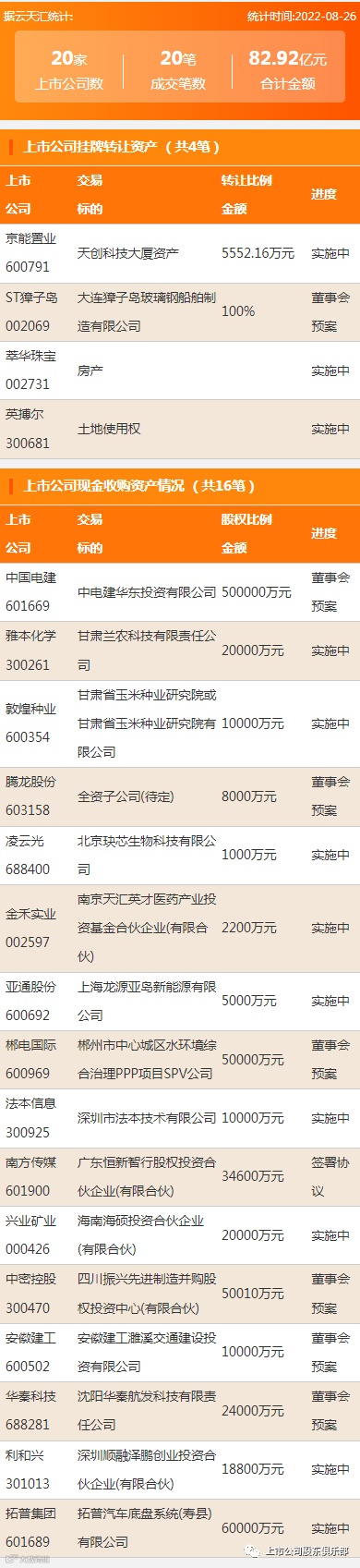 2022年8月26日,资产交易成交金额82.92亿元,上市公司20家,成交20笔,上市公司挂牌转让资产4笔,上市公司现金收购资产16笔。
