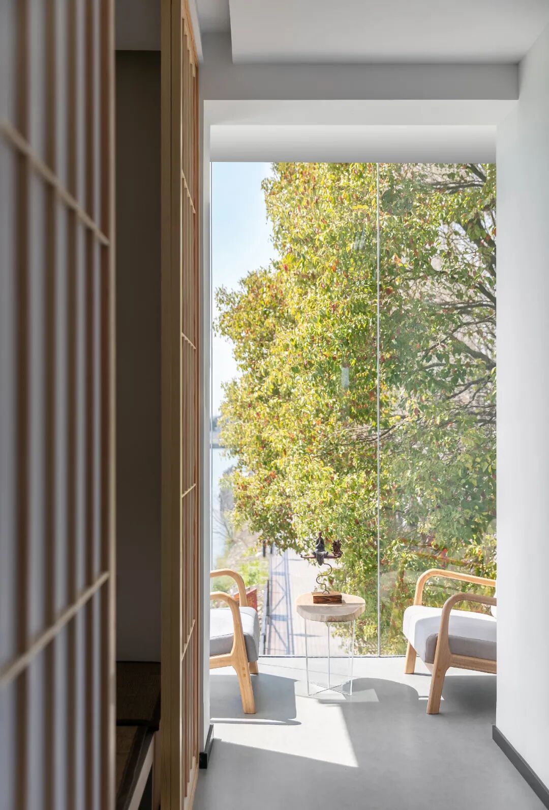 白色墙体上切开一块挑空的玻璃盒子,不仅起到阳台品茶感受的作用,而且还可以网红打卡拍照户外全景效果,每一个时间段都是非常唯美,一年四季变化融入其中;首层的品茶接待区和茶室也非常巧妙向空间延伸,户外的人民河荡漾的波纹水影画面能够反射出室内的光线及倒影。