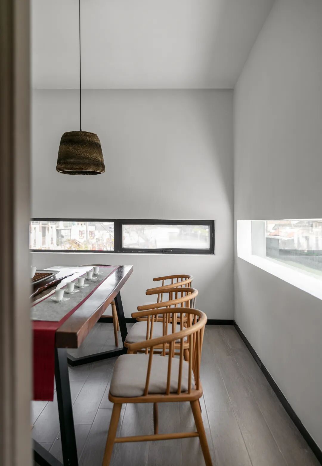 在二层,茶室内有很多水平条窗和对角切割的结构,这同样是为了引入自然光和促进通风。大量元素如太阳照射最强烈的侧墙上的小窗和倾斜的天花板,有助于引导空气的流动,楼梯直达到一楼的人民河墙边,楼梯平台下被改造成储藏空间以及水池区域,最不可思议的是,即使在楼梯上,你也能感觉到空气的循环流动。