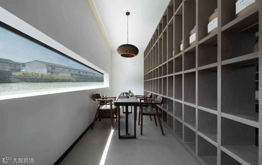 一楼的品茶桌面都采用了老建筑保留下来的粮仓老木门,同时也保存粮仓的历史痕迹。西侧的墙面也是破墙而开,最大化的视觉多变,光与影的重叠相互映衬,建筑拥有充足的自然光和风及水影,在气温上升的早上,嵌入式的玻璃结构体与阳光产生多变效果。