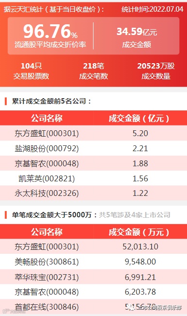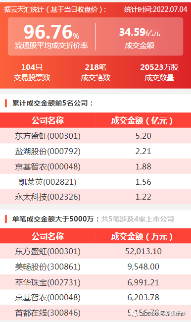 2022年7月4日,大宗交易成交金额34.59亿元,交易股票数104只,成交笔数218笔,流通股平均成交折价率96.76%,成交数量20523万股。