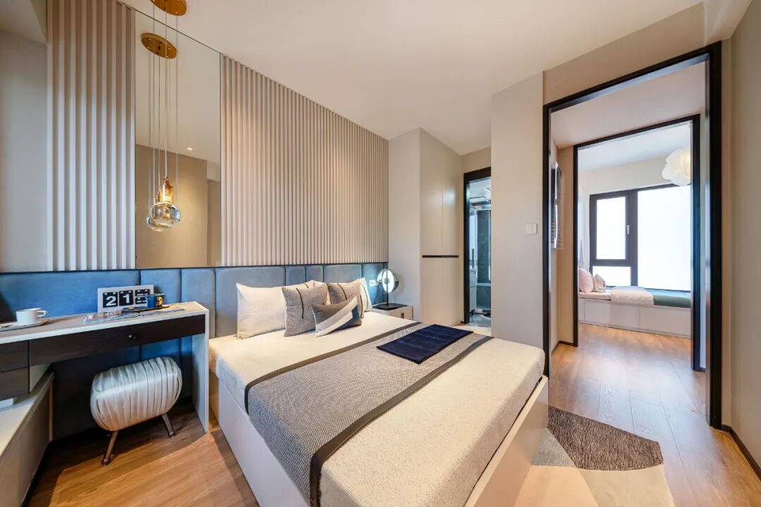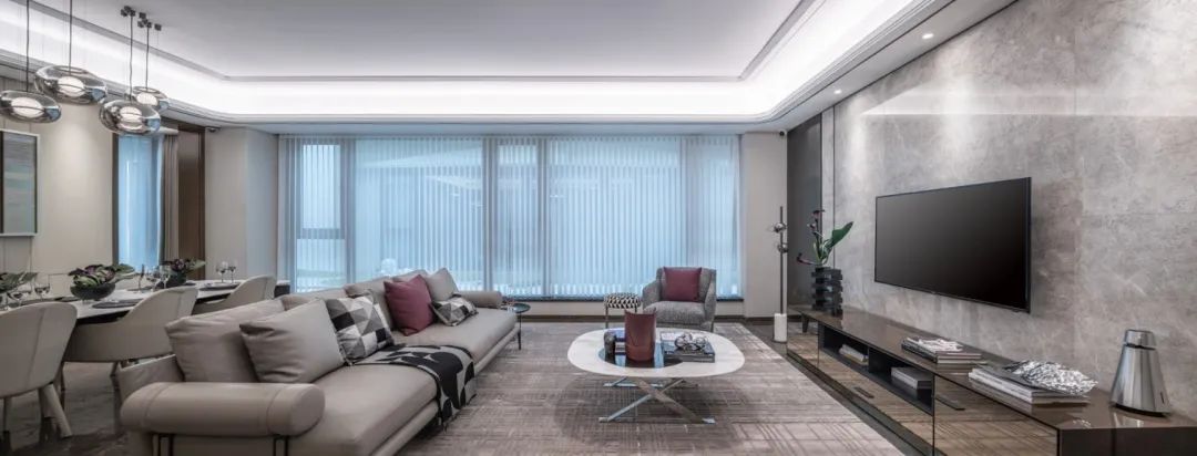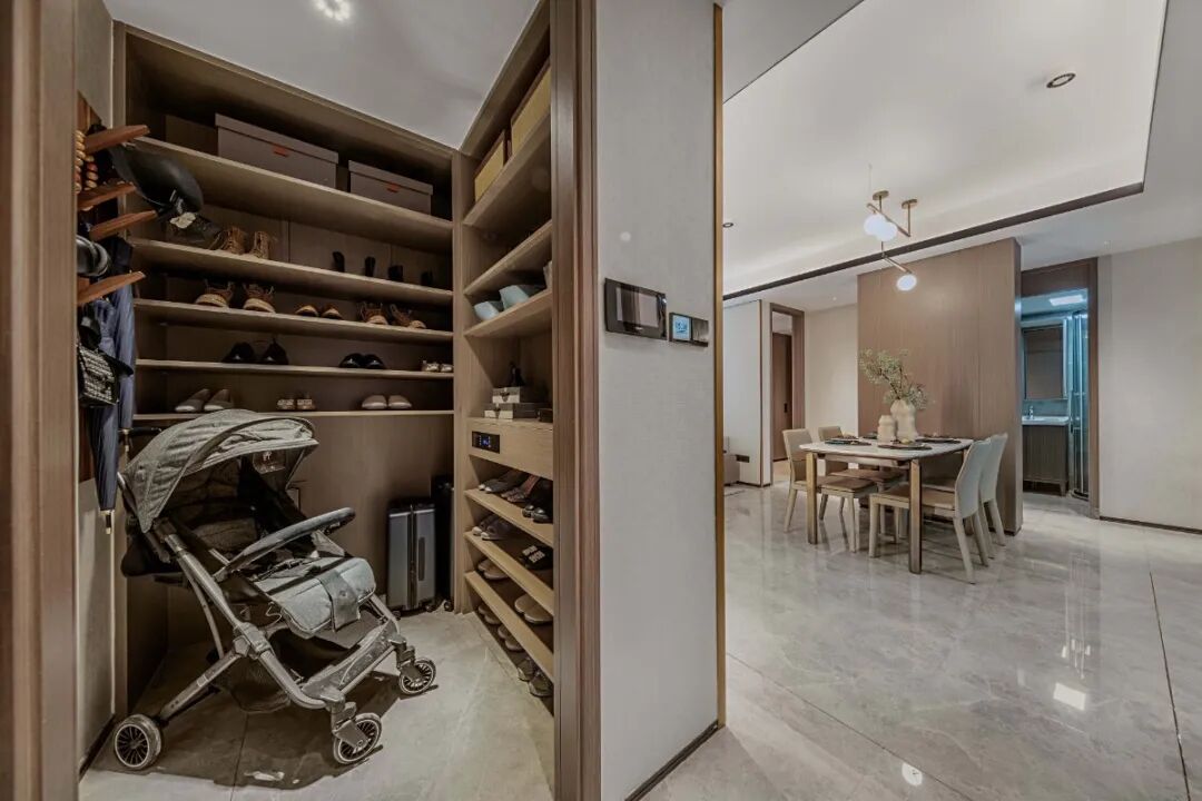 入户之处定制玄关柜,采用三段式功能设计,将有限空间充分利用;南向270°瞰景阳台,将客厅空间与室外景观巧妙联动,让视线无限延伸,四开间布局匠呈理想居所,演绎湾区生活美学。