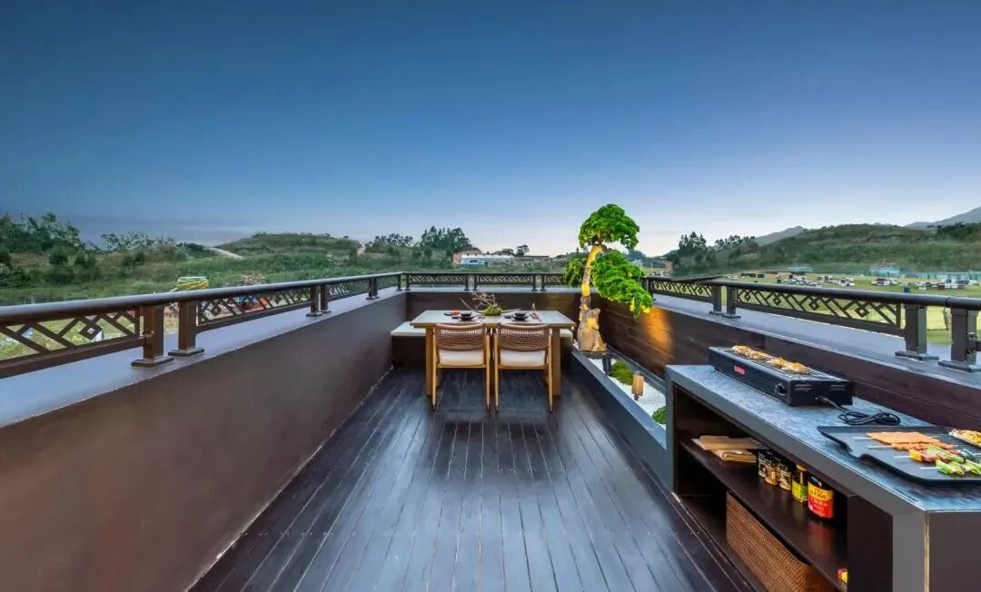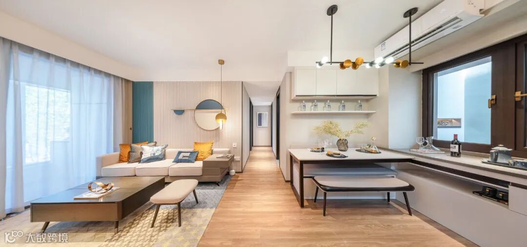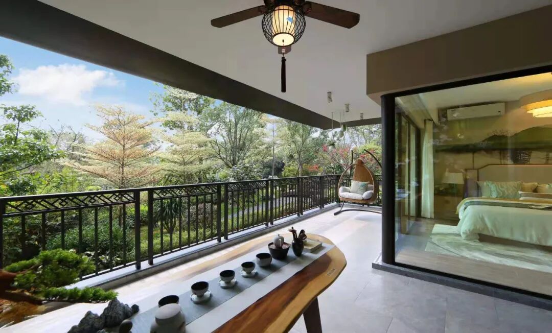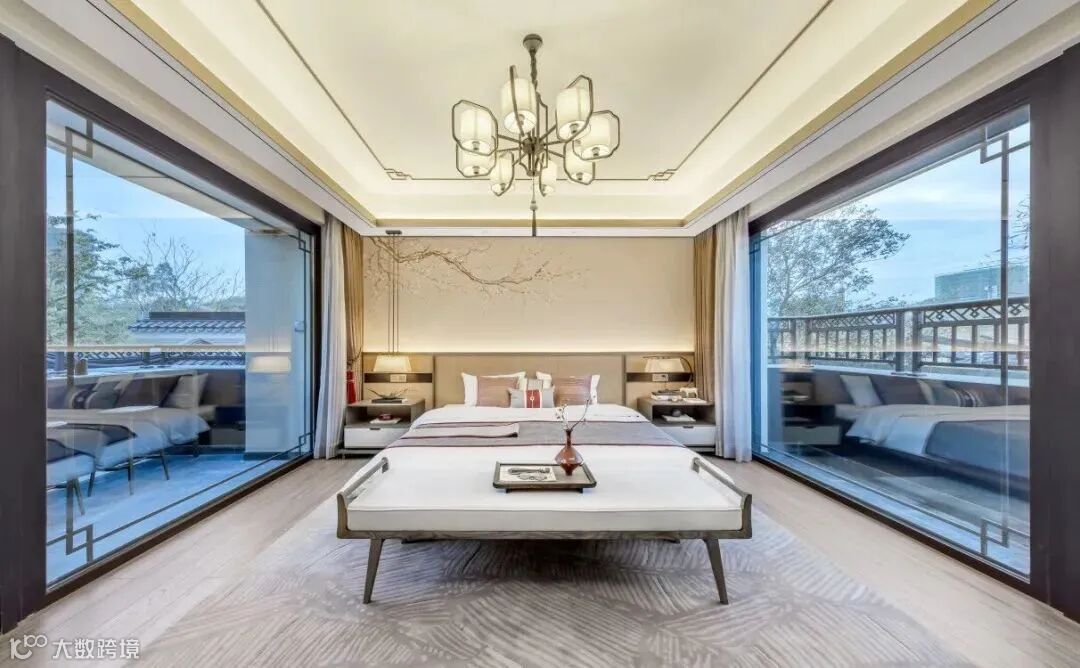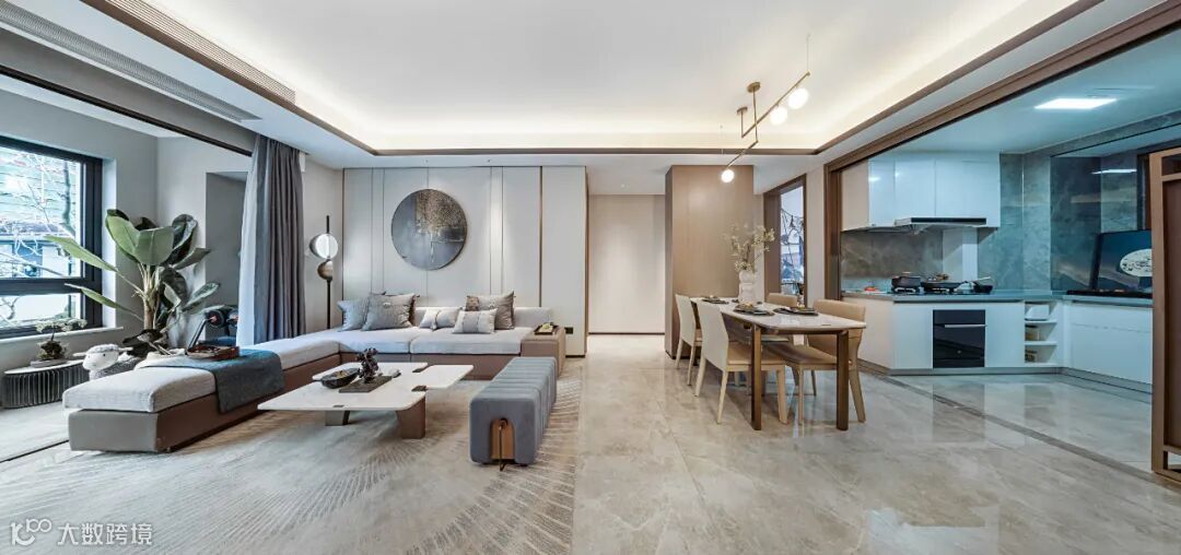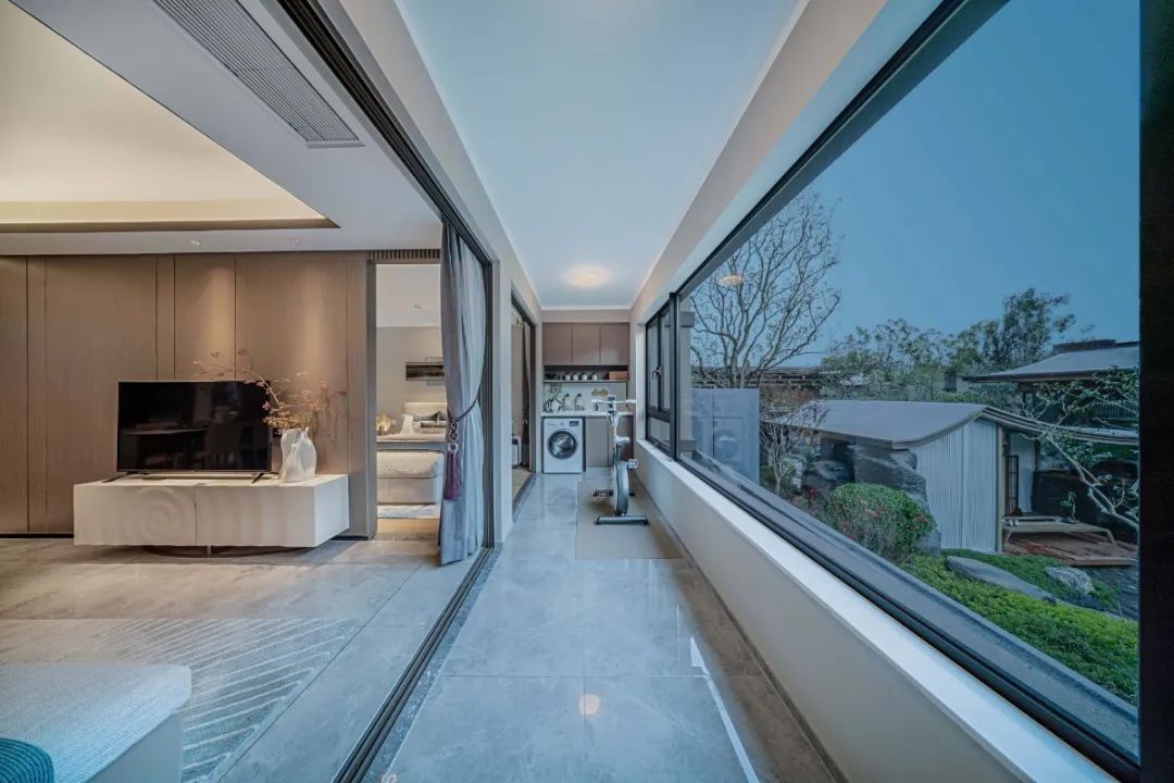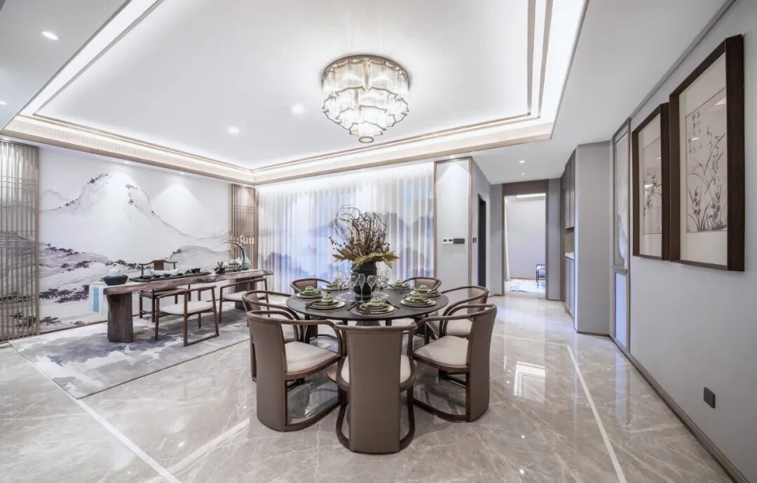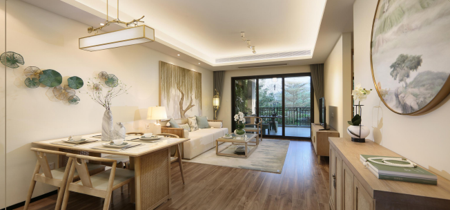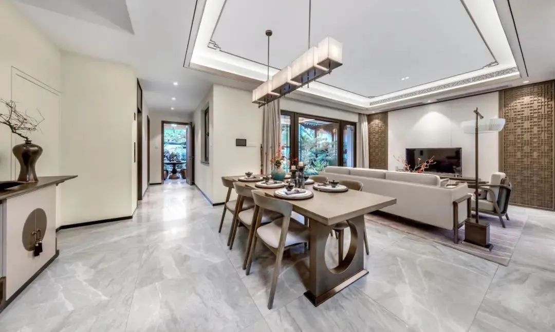 超6米南向观景阳台紧连客餐厅,超大 Low-e 中空玻璃,缔造奢阔宽景视野,一揽中式园林盛景