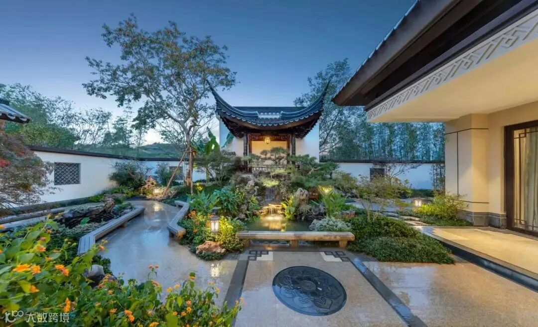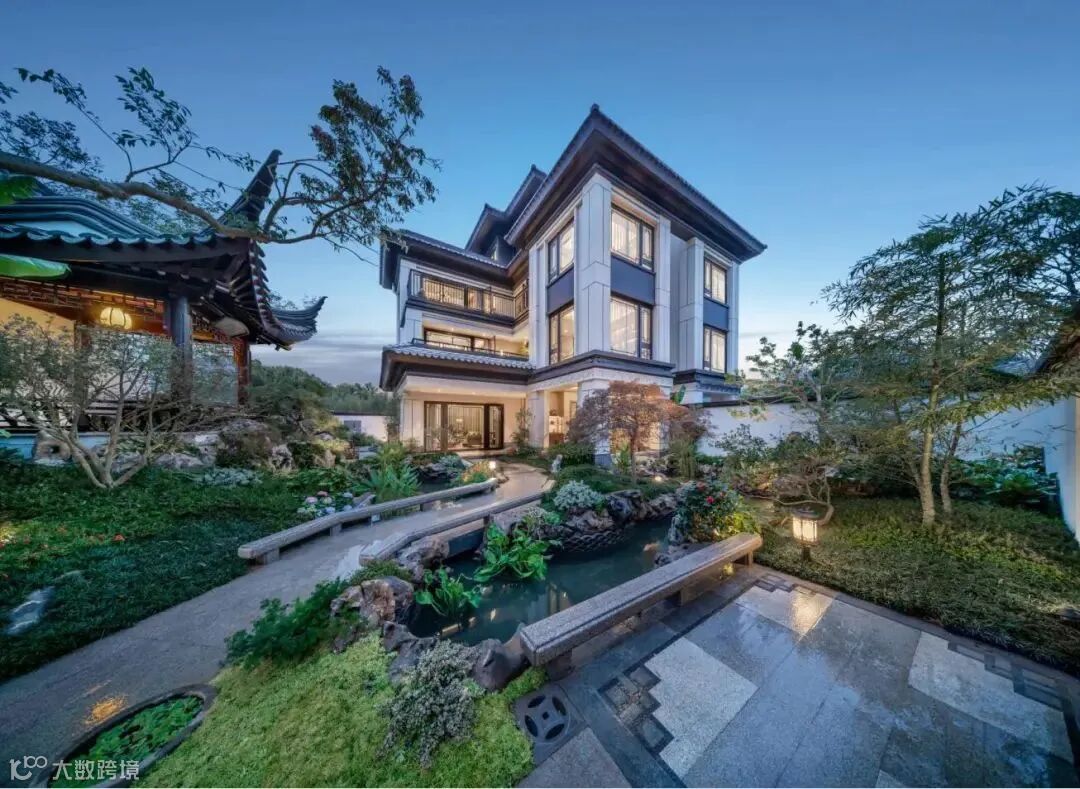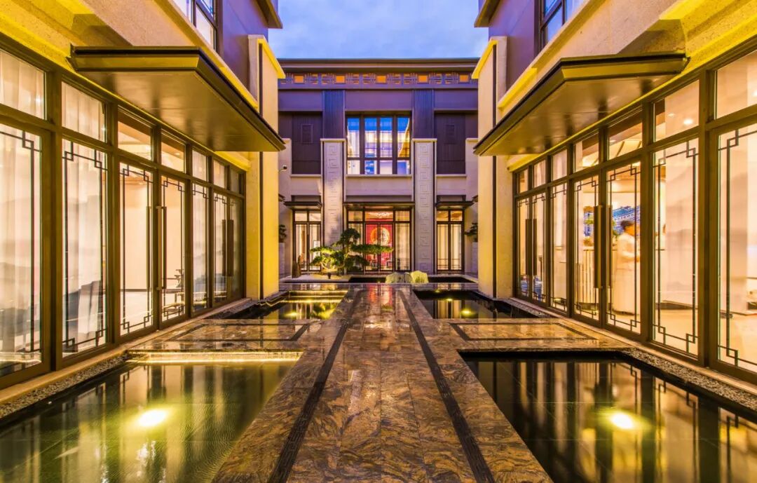 园林,沿用中式至尊的大挑屋檐和三进式递进院礼制的最高规格门进礼序(一进大门望庭院,二经园林春芳歇,三踏游廊入坊巷)