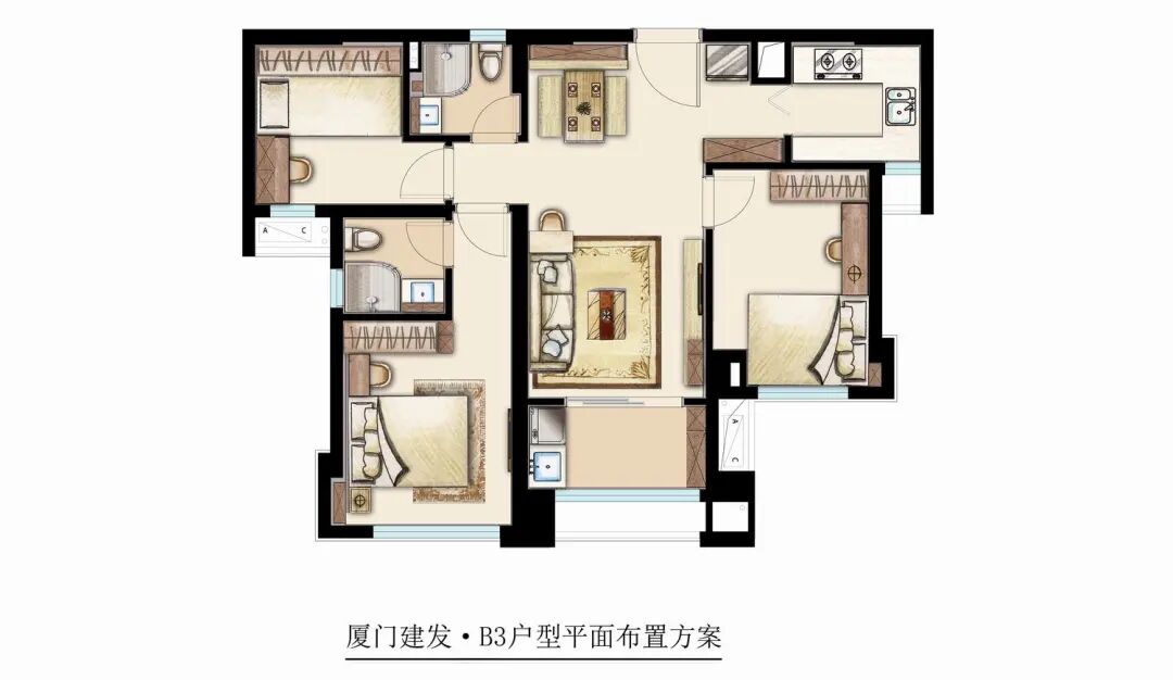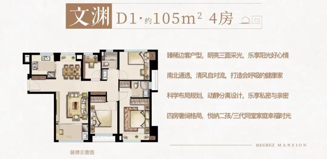 本项目在户型设计上,做到上下层最大化空间,四房三卫双阳台的配置,满足三代人的需求,使用功能齐全。空间尺度上,客厅开间约6米,阳台面宽约6.3米,可以媲美市面上130 ㎡产品尺度,采光面、视野面极佳,房间使用面积合理。