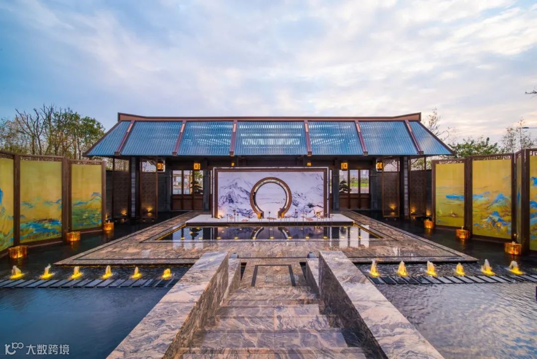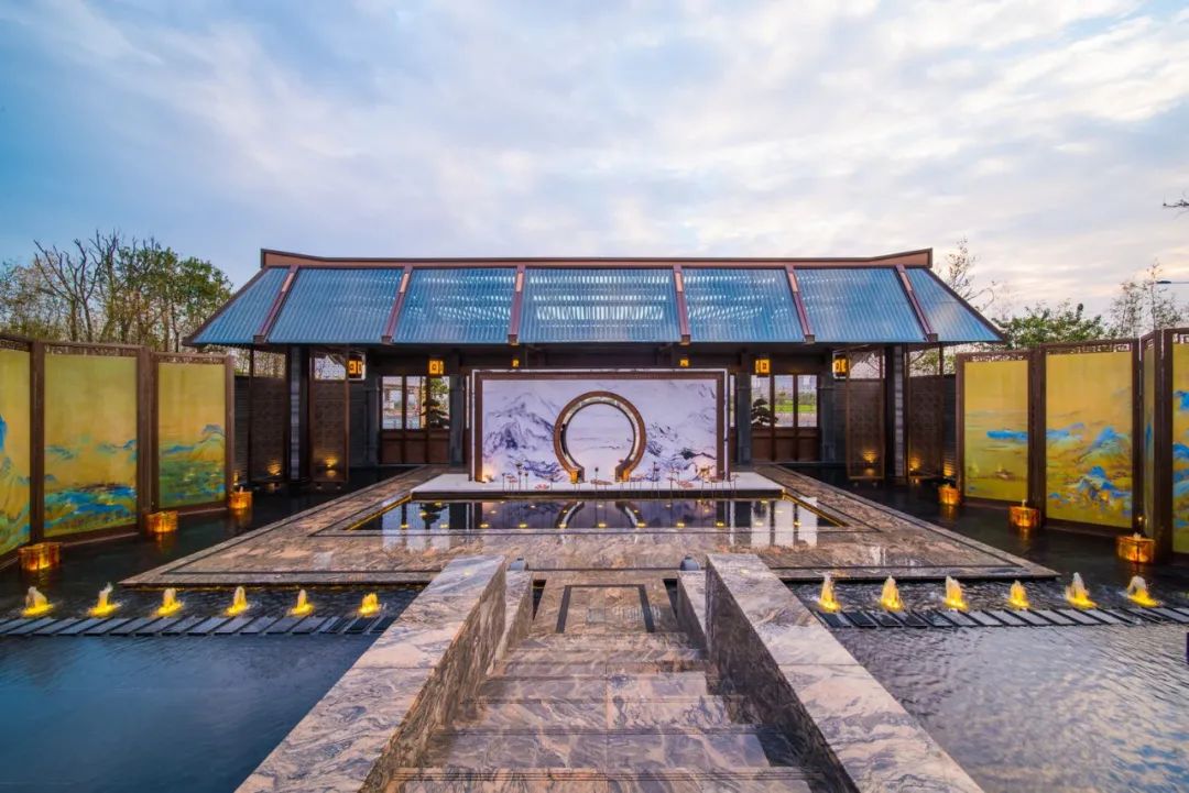 项目的展示区外部打造出皇家的仪式感礼序感,内部表达文人墨客的隐逸情怀。进门是三门三院的礼序引导,园林部分则以苏州留园为范本,打造出小隐隐于野,中隐隐于市,大隐隐于朝的生活意境。