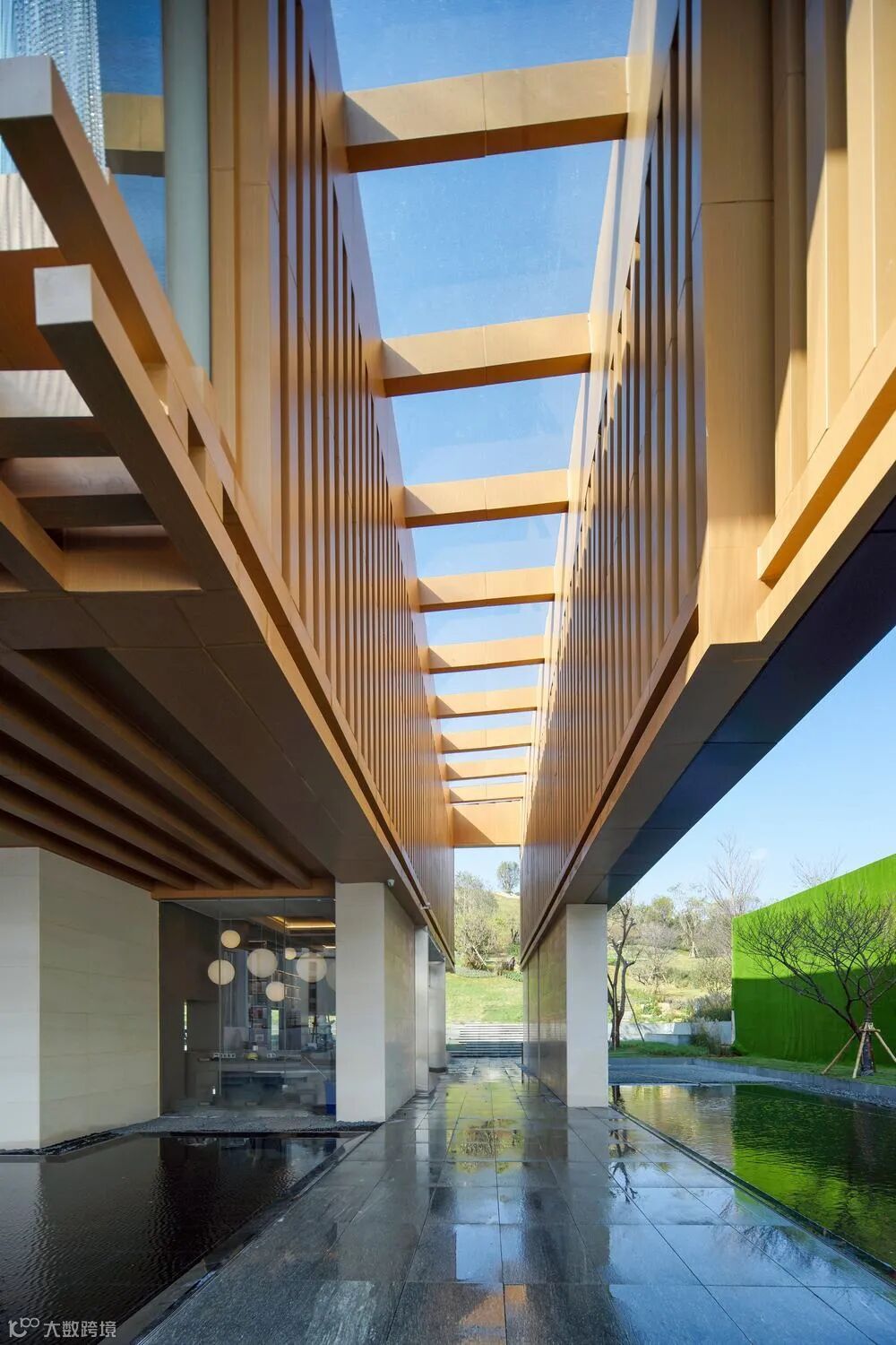 建筑设计在极其苛刻的用地条件下,大胆采用高难度的12米大悬挑结构解决空间使用问题,积极营造底层公共空间,并为市民留出一条通往山体公园的道路;同时以现代的设计手法成功演绎出了大屋檐、瓦顶、斗拱等中国传统建筑形式,尤其创新地利用铝链模拟了中国传统纱帐效果,营造了极具东方美学的“犹抱琵琶半遮面”的特殊效果。