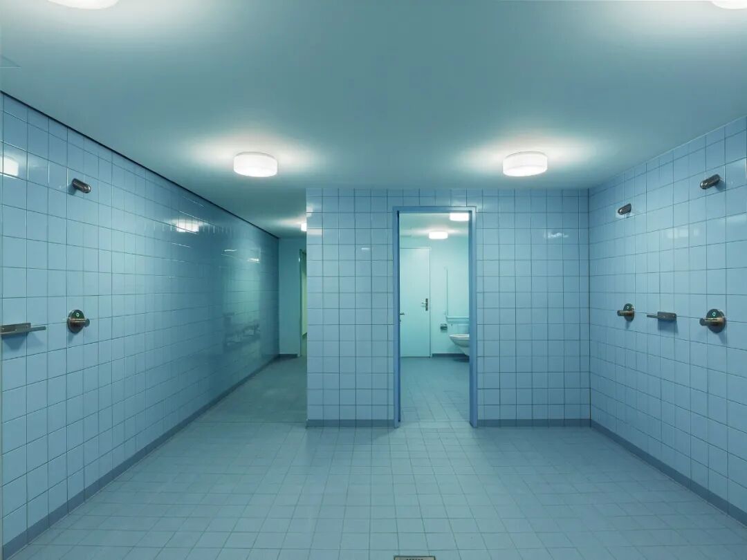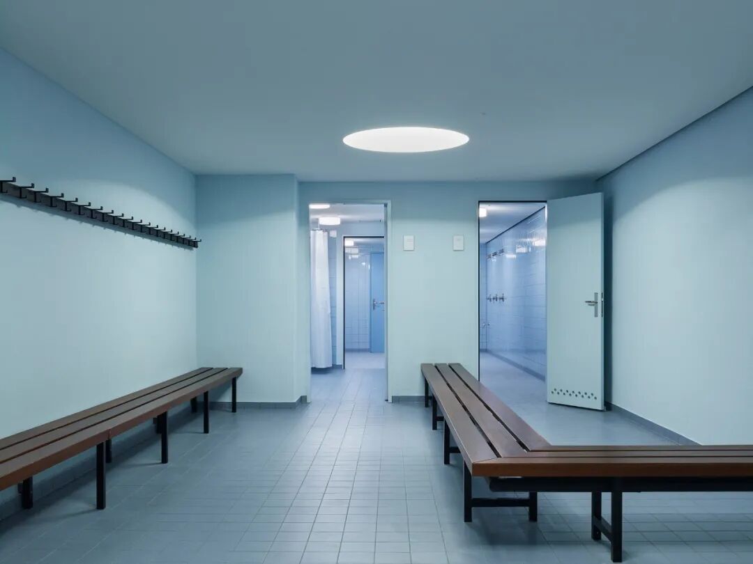 All surfaces in the two gymnasiums were revised. The windows and floorings were replaced. The newly insulated roofs are clad acoustic panels. The oak-veneered wall panels were repaired and sanded. A different, finely graded shade of green and blue was chosen for each changing room to facilitate orientation.