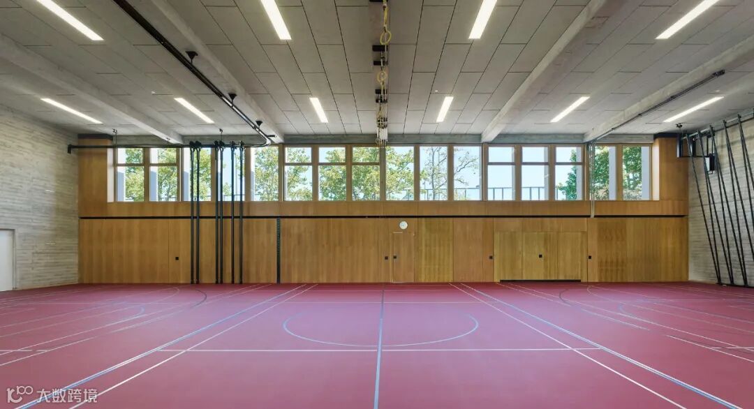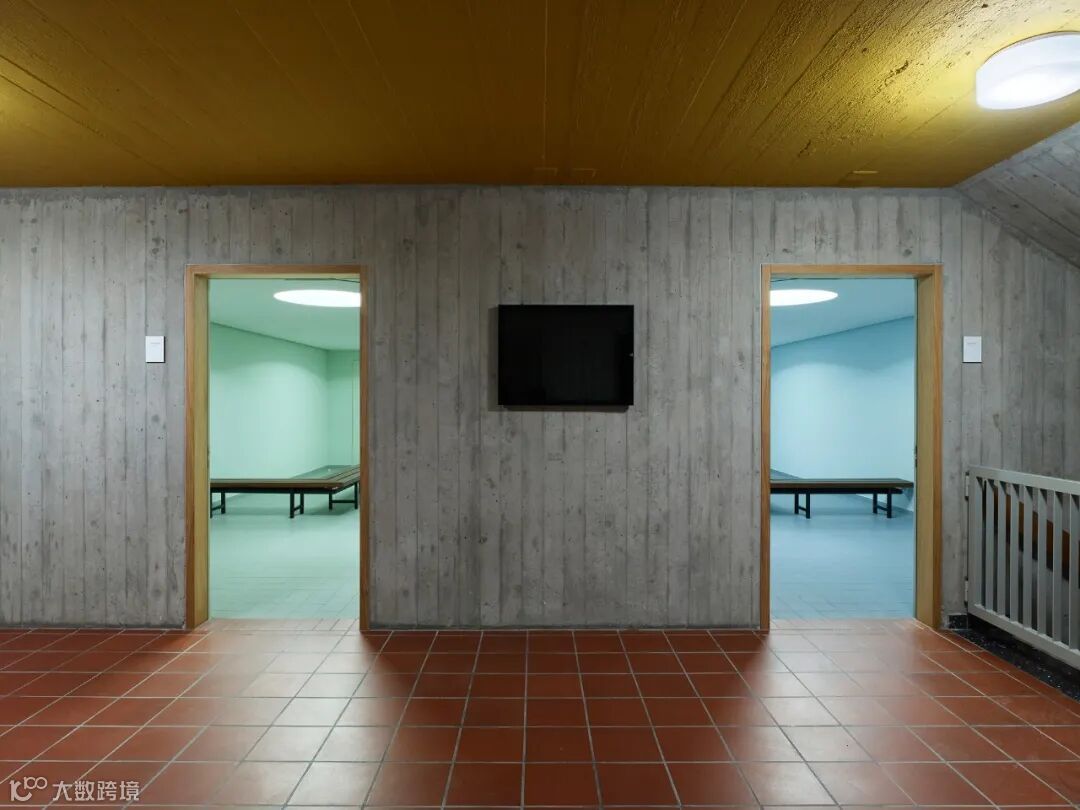 两个体育馆的所有表面都进行了修改。窗户和地板都换了新的。新的隔热屋顶覆盖了隔音板。橡木镶板的墙板经过修补和打磨。每个更衣室都选择了不同的、精细渐变的绿色和蓝色,以促进定位。