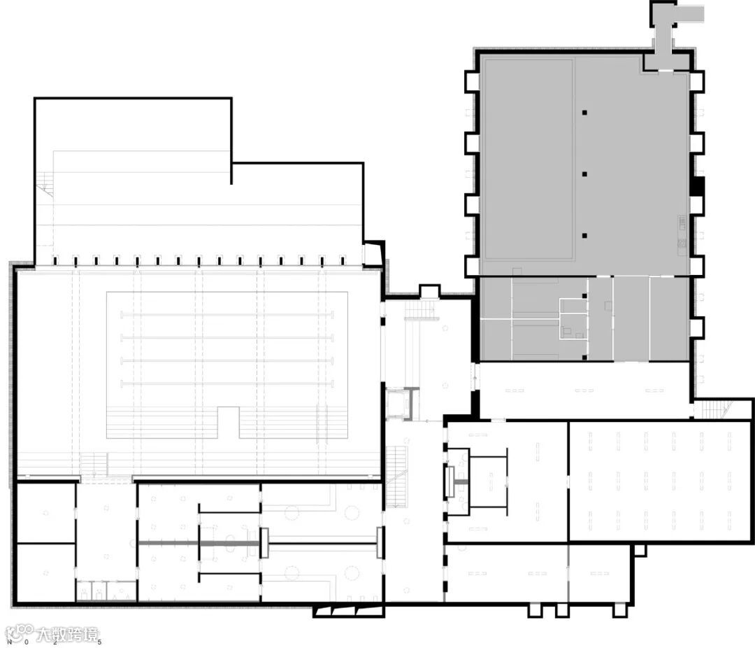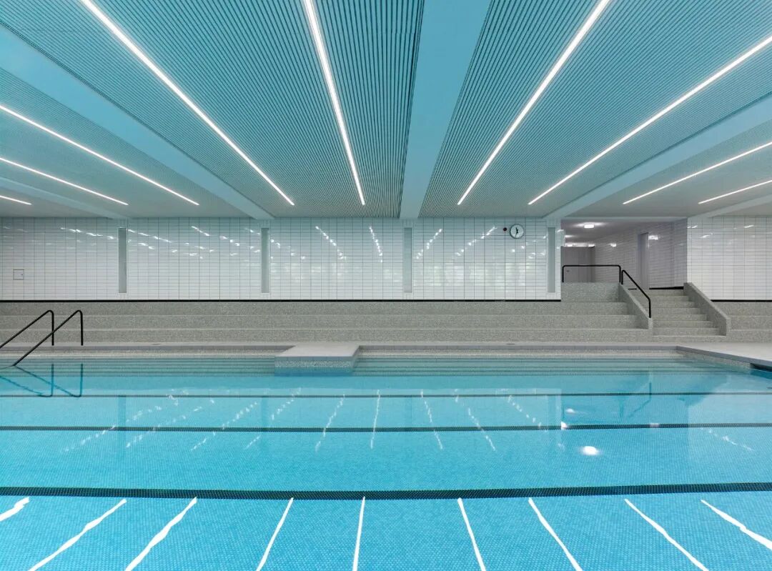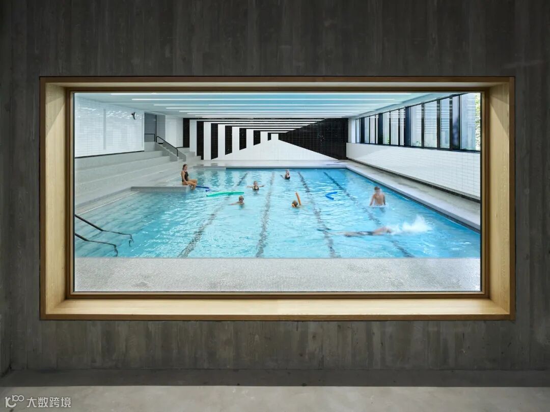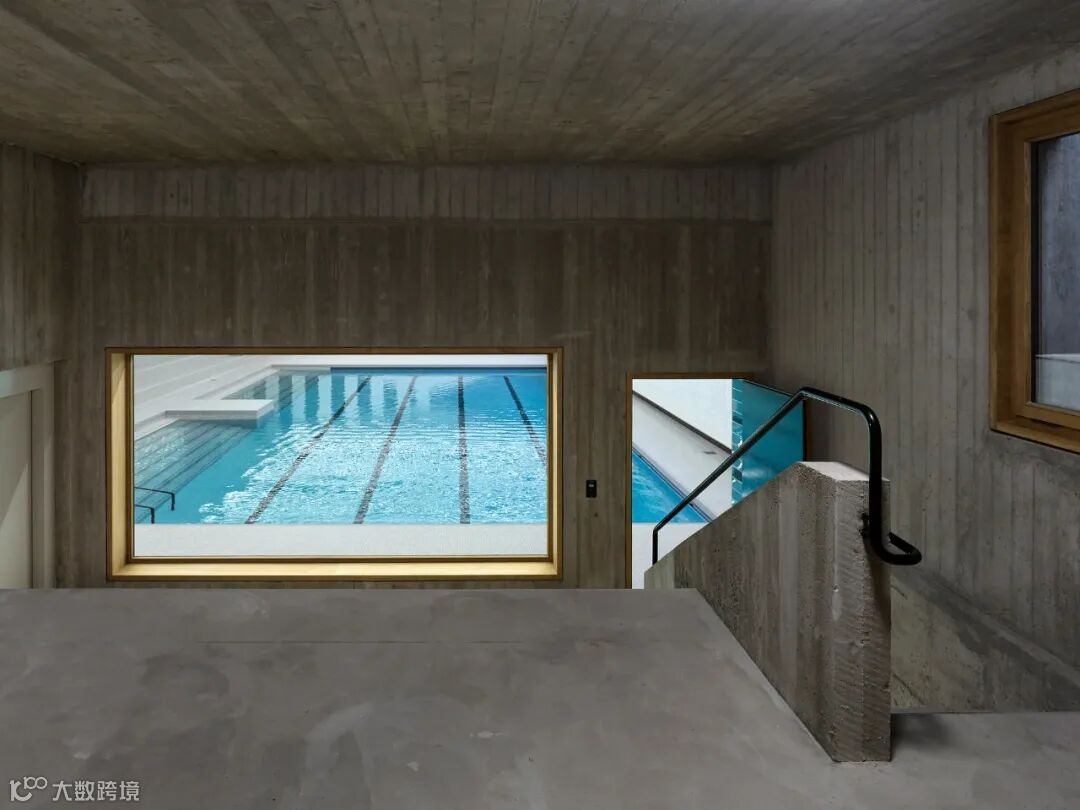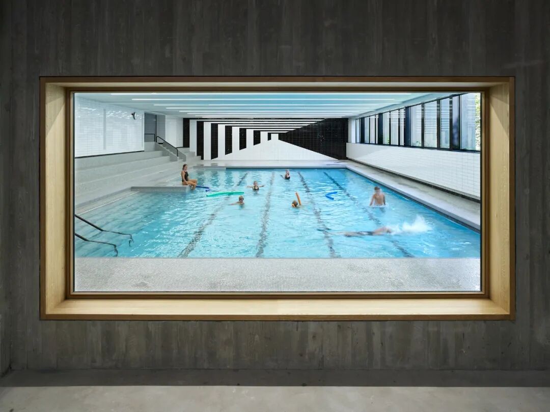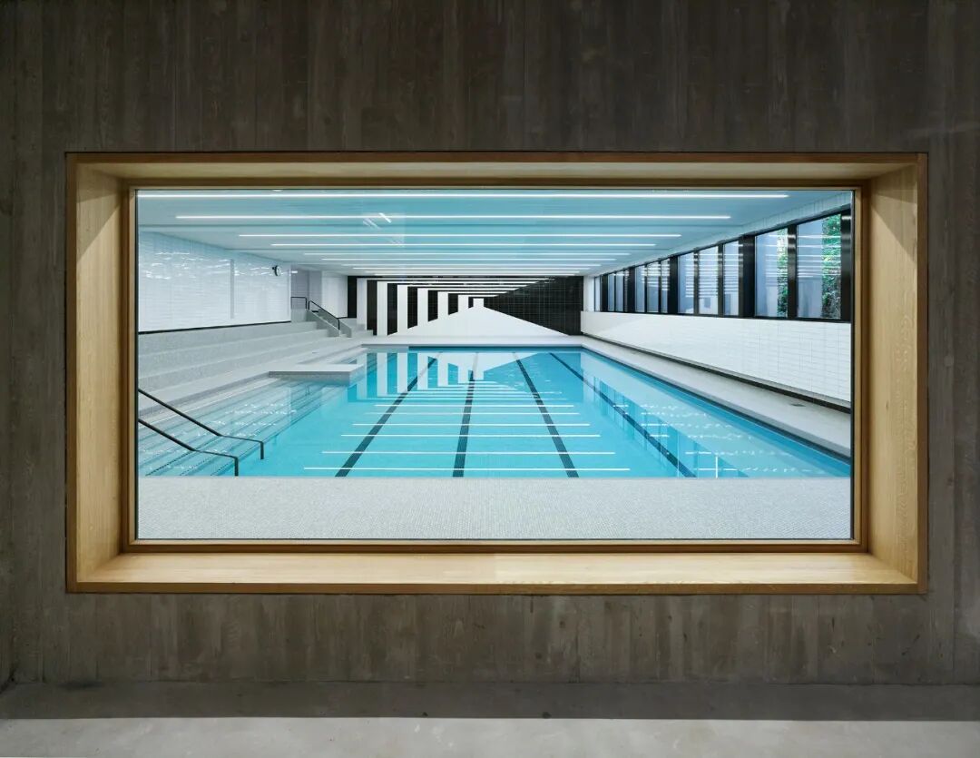 新的电梯两边都有门,轮椅可以进入地下室和游泳池。毗邻游泳馆的接待室设有大台阶,为游客提供座位。一扇观景窗映出了游泳馆的景色。