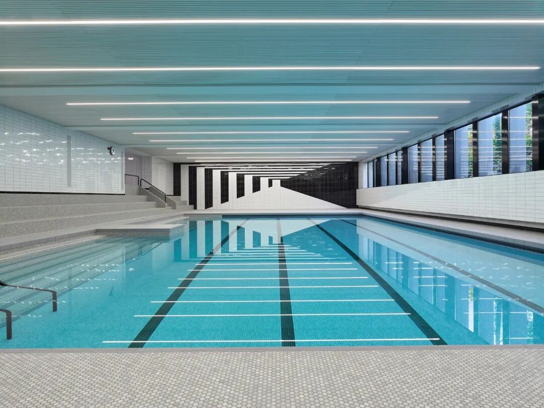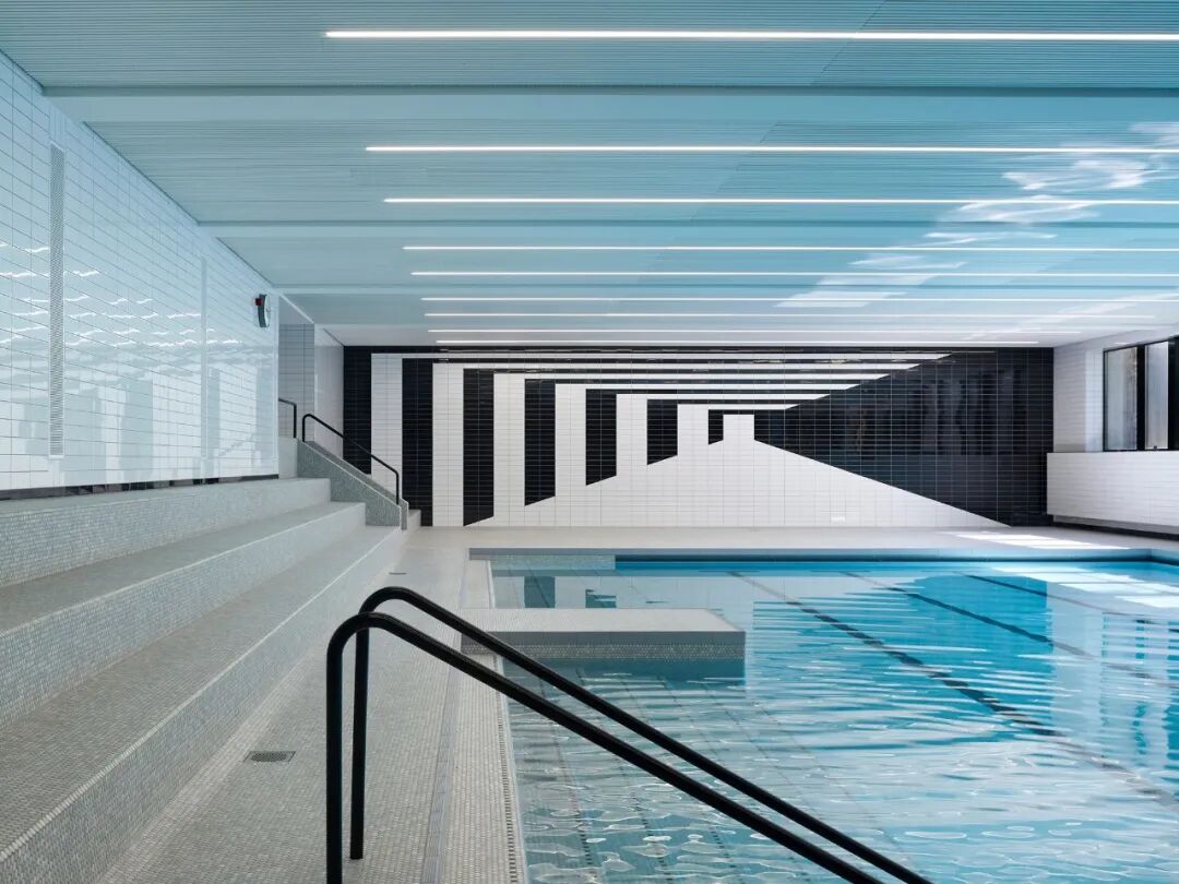 The swimming pool was technically upgraded and finished with penny tiles. On the walls, white and black tiles form bold contrasts to the blue of the water. A graphic pattern on the back wall of the hall plays with the perspective and lends the pool a new identity.