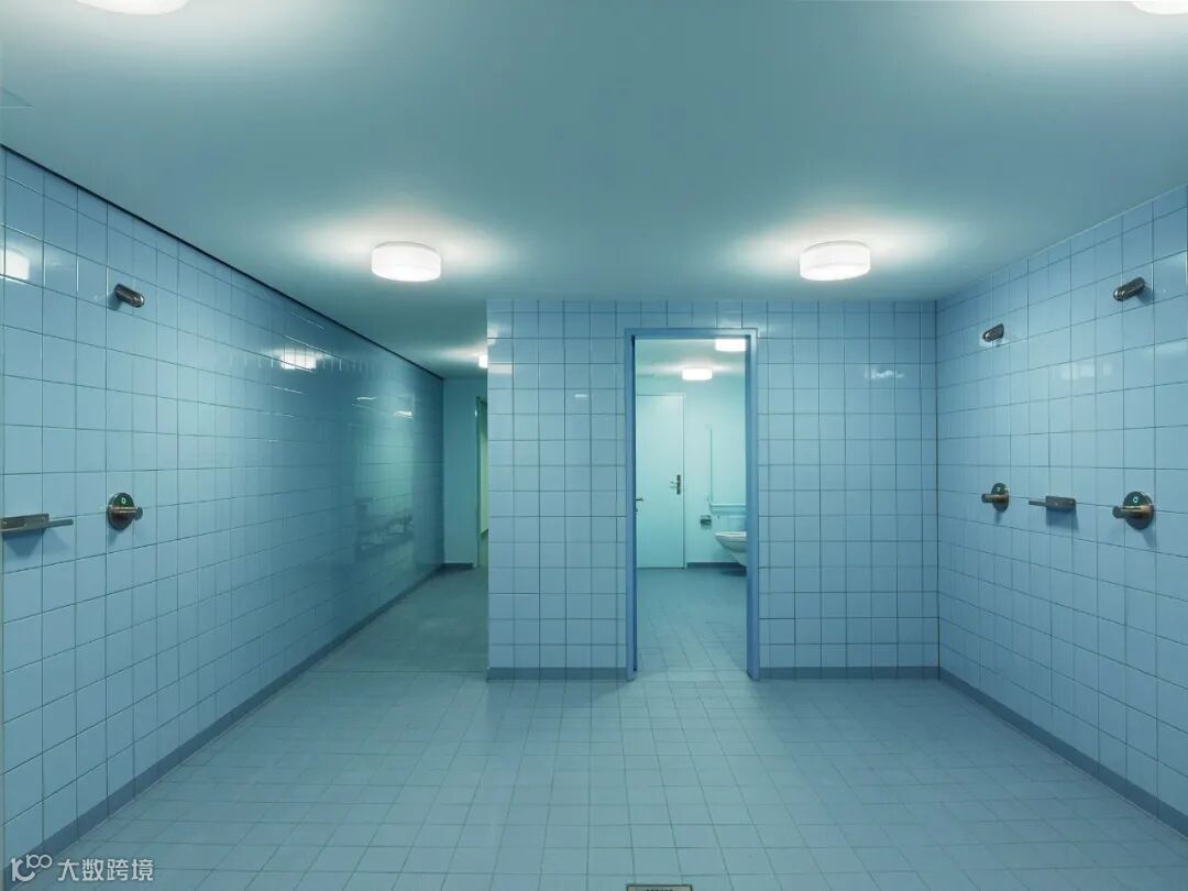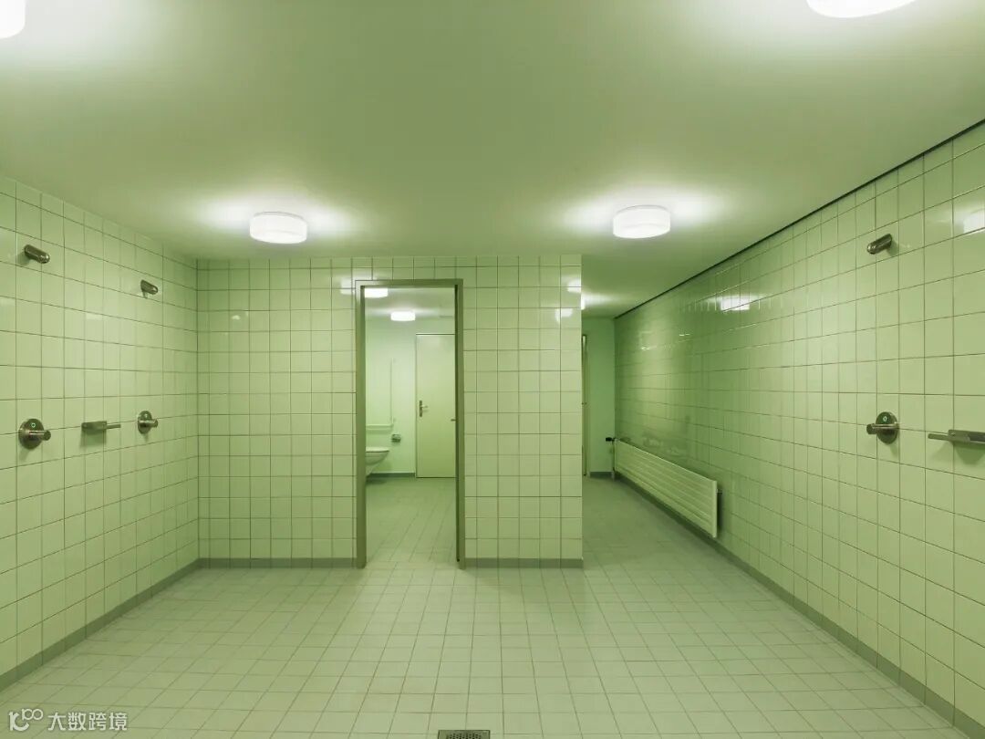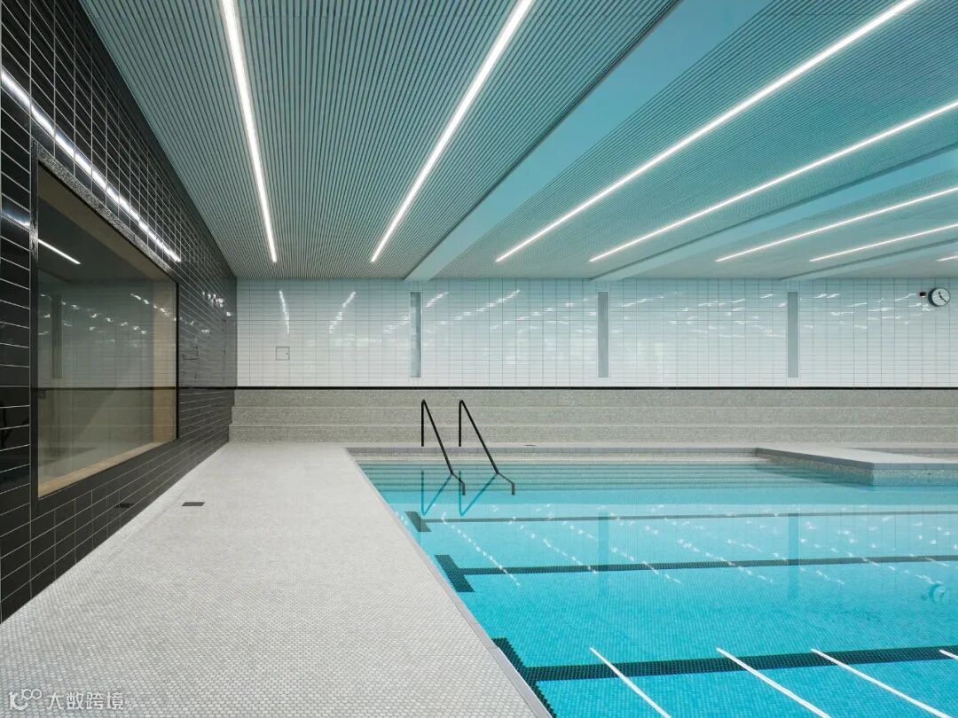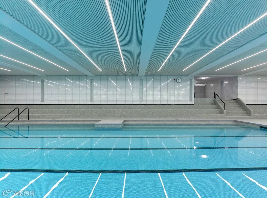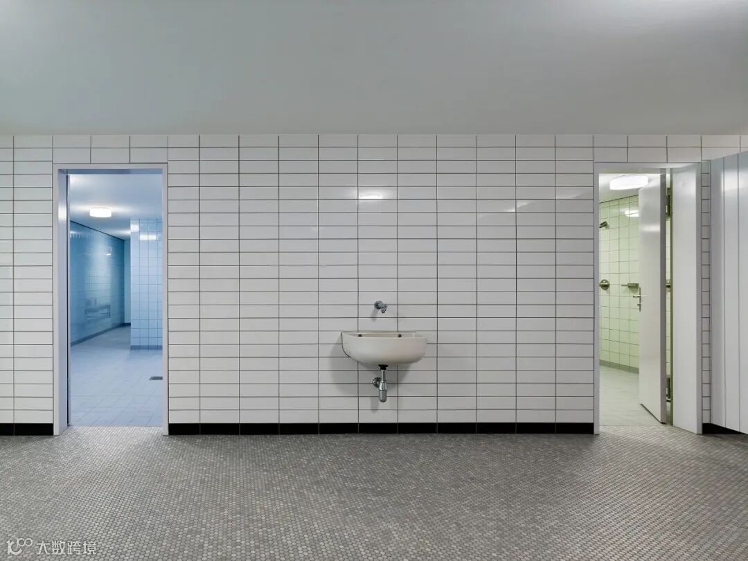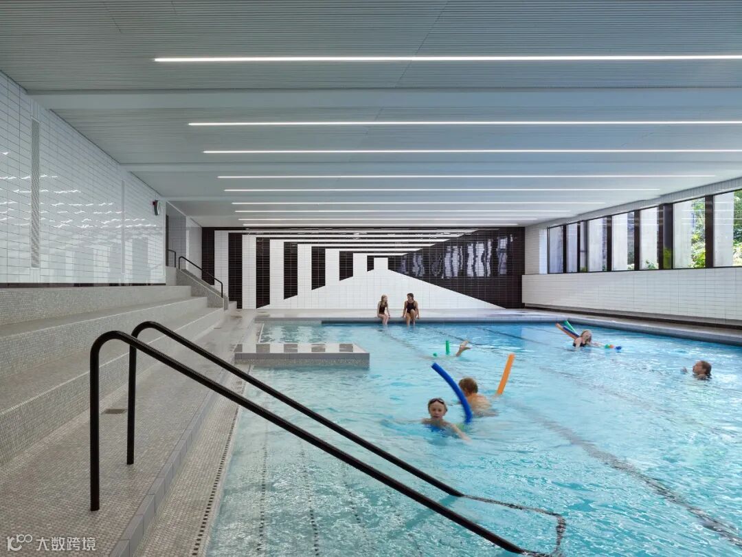 游泳池在技术上进行了升级,并使用了廉价瓷砖。在墙壁上,白色和黑色的瓷砖与蓝色的海水形成了鲜明的对比。大厅后墙上的图形图案与透视相呼应,为泳池增添了新的身份。