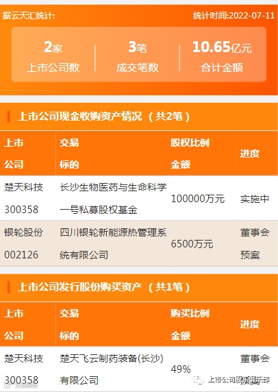 2022年7月11日,资产交易合计成交金额10.65亿元,上市公司2家,成交3笔,上市公司现金收购资产2笔,上市公司发行股份购买资产1笔。