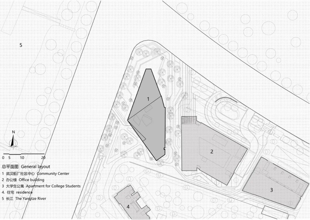 位于武汉白沙洲原南华船厂地块的船厂社区中心,紧邻长江,基地向北可远观鹦鹉洲大桥全貌,景观视野尤为舒展,现今,城市更新在基地所在片区正如火如荼的铺开,并即将推动船厂地块从工业旧址到现代城区的整体蜕变。