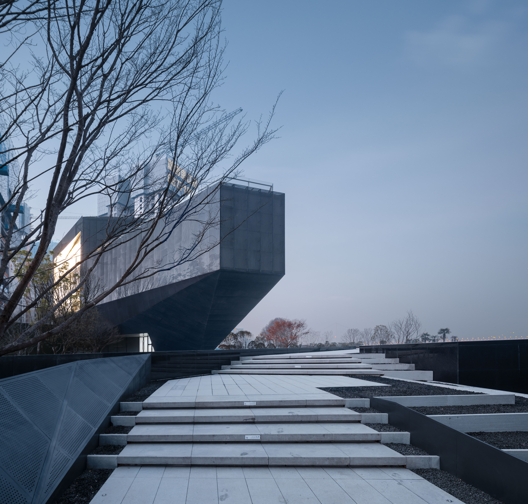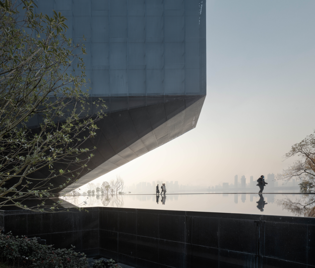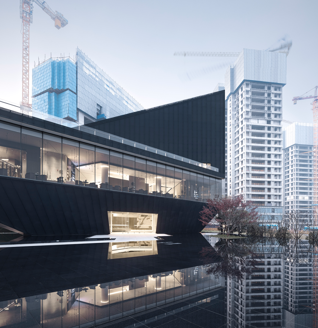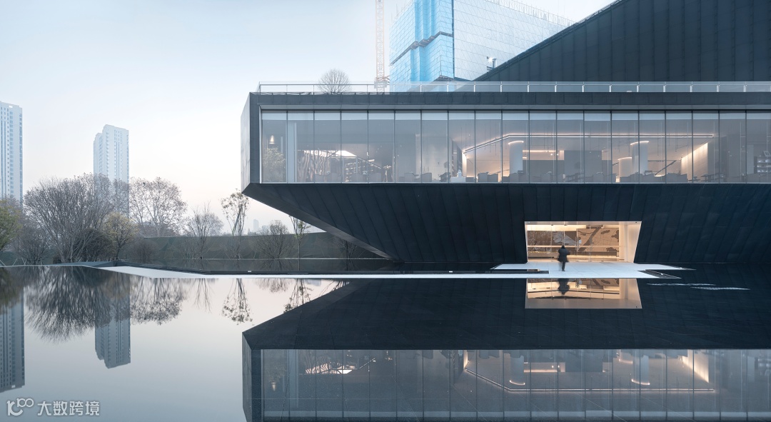 建筑本身是多义的,既直抒凝重的张力,也诠释力量与轻盈的共存。建筑底层无窗且内收,在镜面水池的映衬下,如同行驶的船舰,带来动静对比趣味,巨舰的形式寓意不言而喻。
