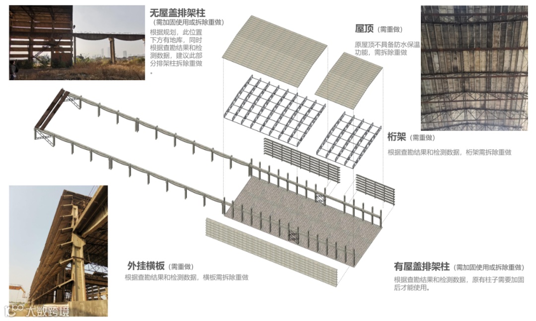 原有3号厂房拥有约200米的建筑长度巨构空间,走进厂房即被巨大的尺度所震撼:厂房东西向轴距约为34米,南北向轴距约为229.4米,共26个开间,建于上世纪六十年代,建筑面积约为7860m²。