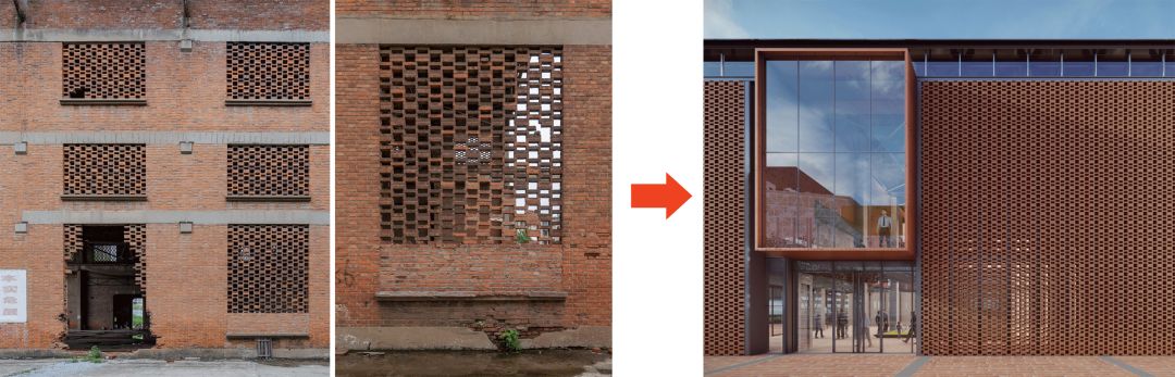 整体外立面延续原锡钢厂的镂空砖元素,镂空部分用玻璃砖进行填充,红砖与玻璃砖有机地结合,在保证了室内保温和隔热的同时,仍然带有传统的建筑色彩,呈现出既现代简洁又有工业风味的特质。