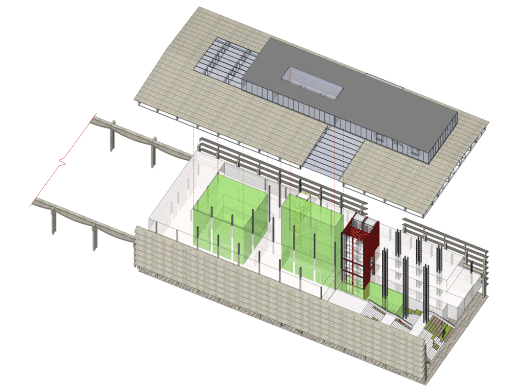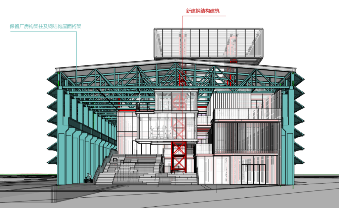 滨水界面保留老牛腿柱及旧的屋架体系,设置通透大玻璃立面+灰空间雨棚,使邻水界面更为通透,雨棚的设计也给室外提供了更多的活动场地,在保留其工业属性的基础上也提升了功能的附加值。
