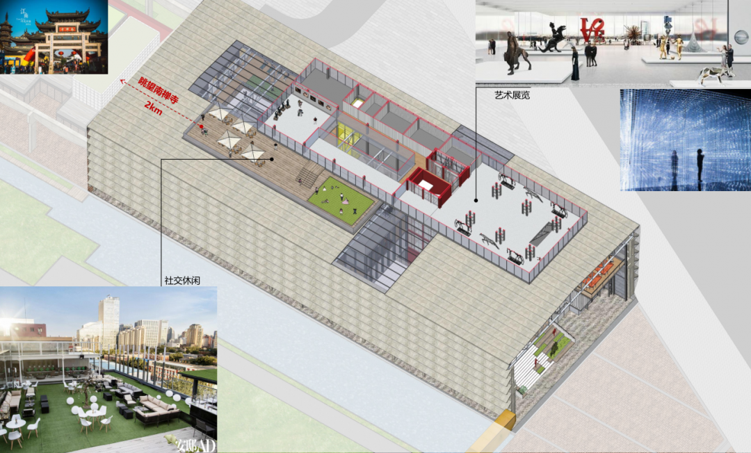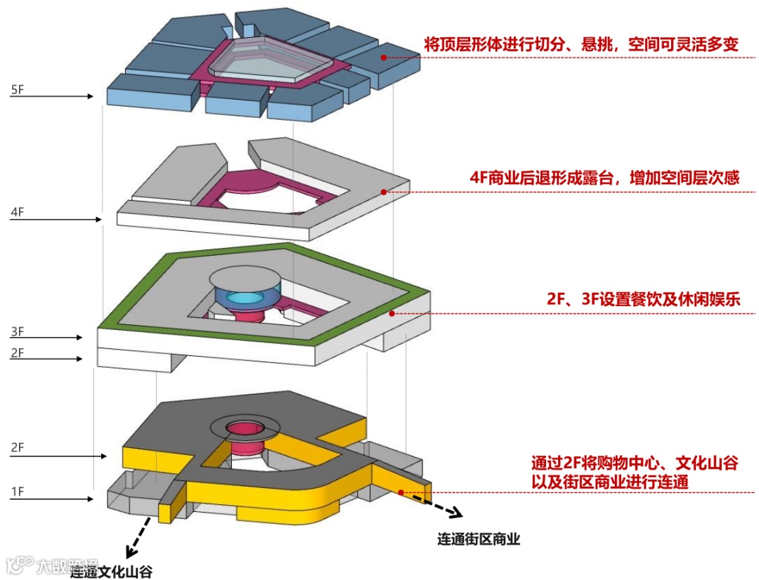 这三大分区内包含五大空间:集盒购物中心、高街、文化山谷、游客集散中心、水岸新里。