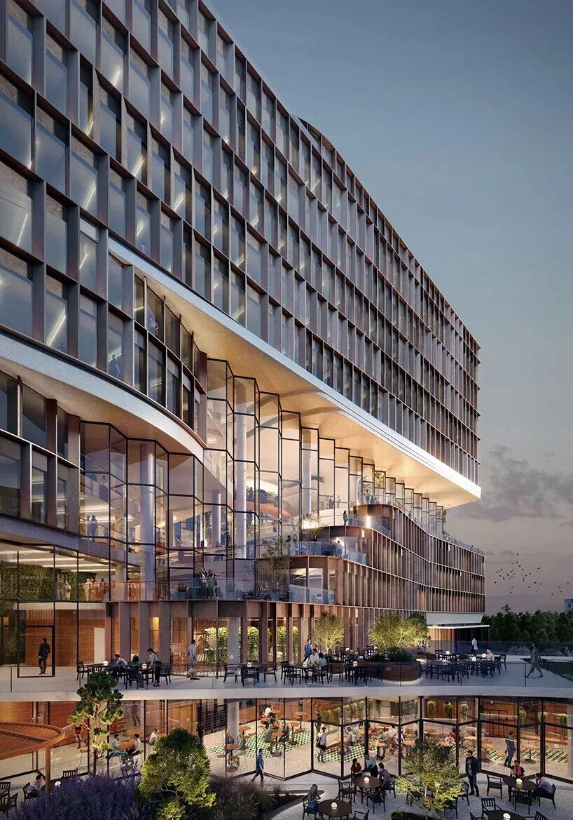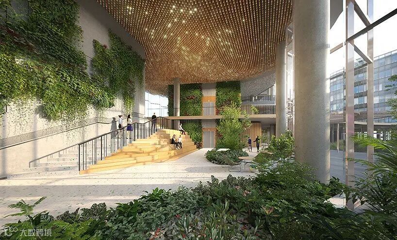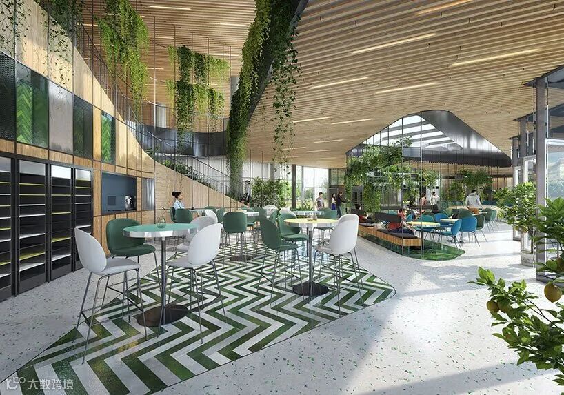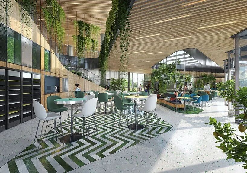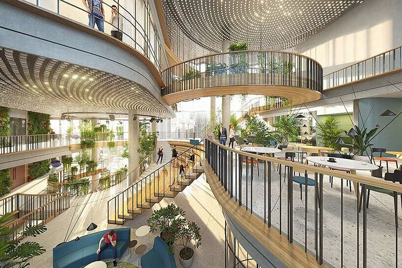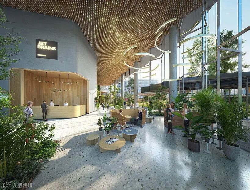在设计的中心,一个大型的、垂直阶梯式的室内中庭蔓延开来,成为一系列的室外庭院和露台。这个中庭形成了新的jetbrains社区的核心,因为它为身体、心理、社会和环境健康创造了条件。
