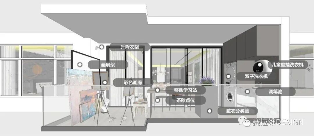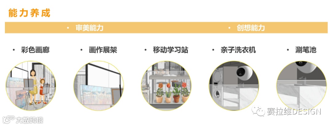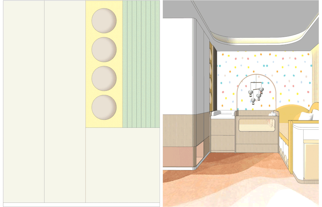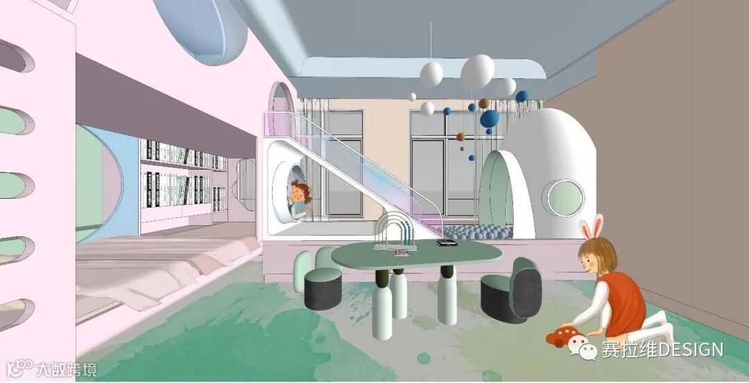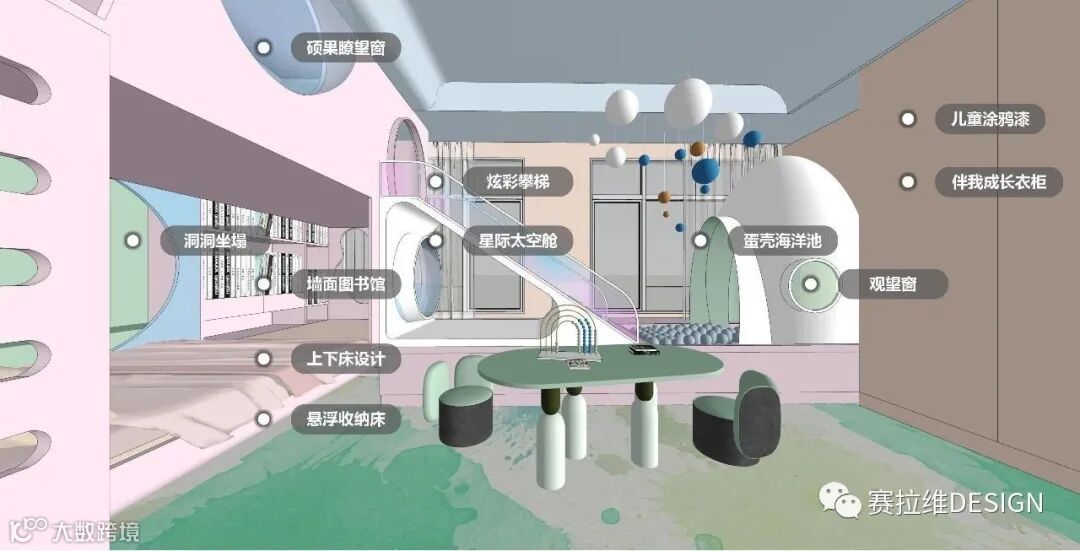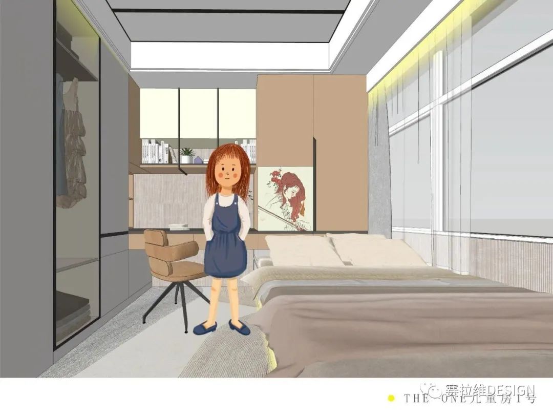 儿童的最早期开始就有明确的视觉偏好,“喜欢立体的胜过二维的物体;喜欢反差大的胜过反差小的轮廓;喜欢弧线的胜过方形的图案”。运用几何体形状设计炫彩云梯、蛋壳海洋池和星际太空舱三大童玩区。为“敏感期”的儿童营造一个天性乐园。次卫按照适老适幼打造,让孩子感受每一个生活情景,儿童房墙面设计智能玻璃,一键雾化、一件透明功能可以关注儿童时态,保障儿童隐私。
