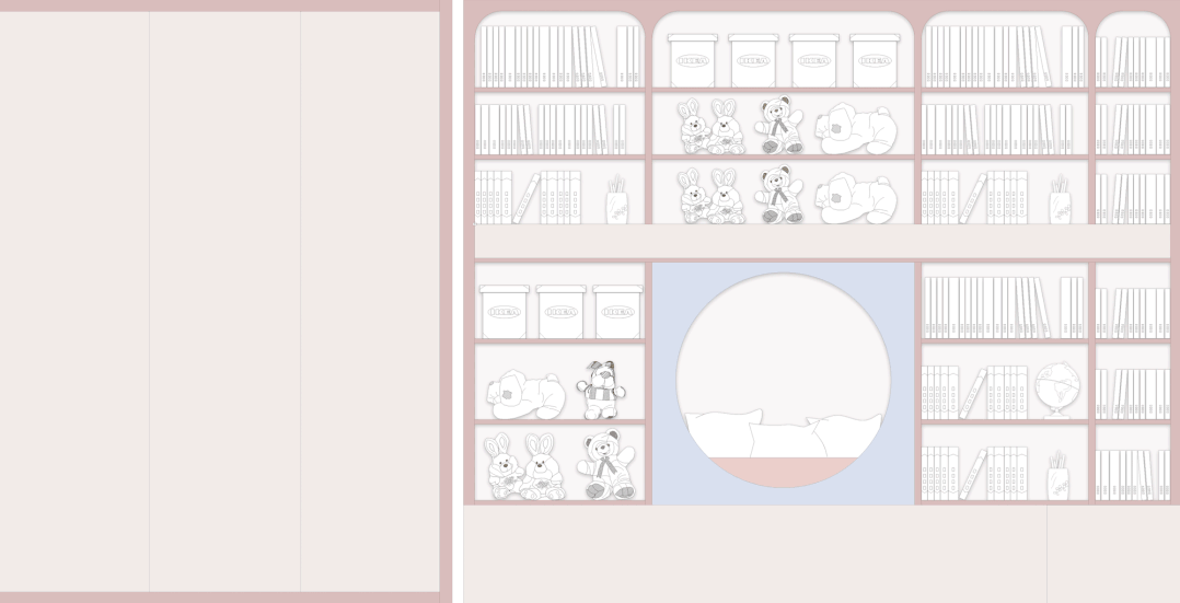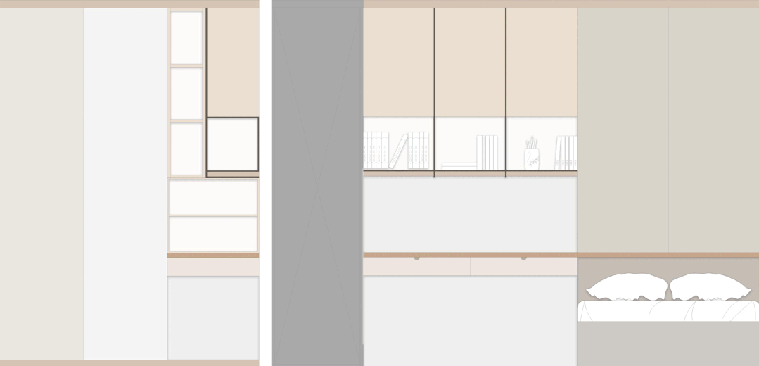 成长衣柜在这个时间段需将底部高抬区设置成坐墩盒子的安身处,同学来访时,有足够的座位,同时具备脚踏功能,可以自行拿取衣柜高处的衣物。在床头后方留出35cm的尺度,安置床头书柜,满足床头读物的随手放置以及个人的小小收藏天地。