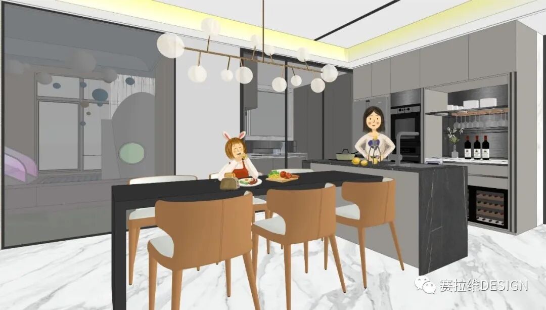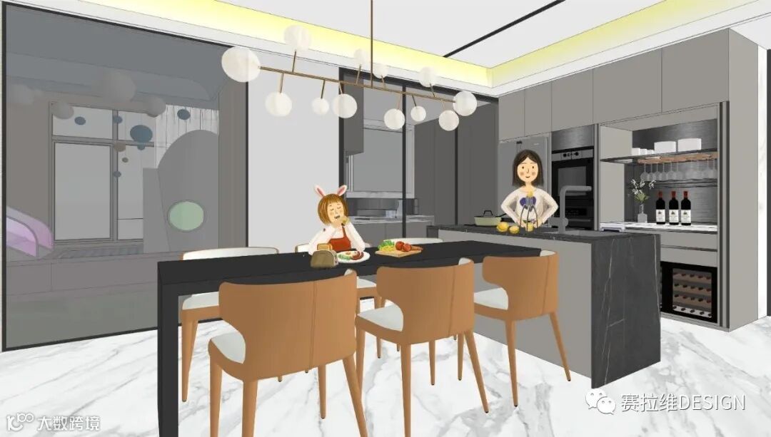 餐厅与西厨结合,打造超强烹饪系统。Nancy美妈可以在亲子岛台教U姐和U妹认识食材,体验烹饪乐趣。西厨布置酒水柜和电器柜,并增设垃圾降解机,厨余垃圾可以直接降解成有机土壤用来培育儿童房的成长树,让小朋友感受到自然的力量,打造可循环绿色厨房。