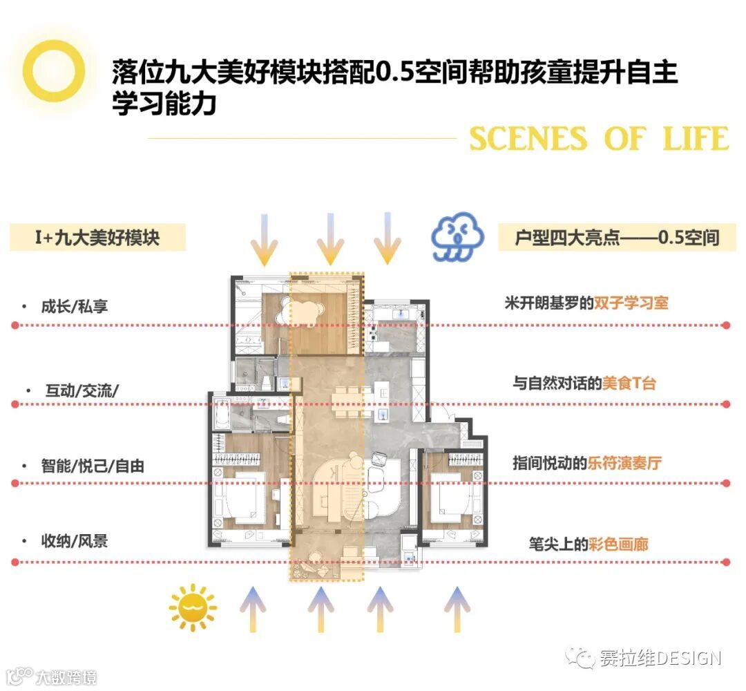 融创上海区域聚焦“ i 家庭 ”版块,于对主流客群年轻化的趋势,提出的全新生活主张。联手赛拉维CLV·DESIGN通过细分新一代主流客群并梳理不同场景下的的痛点、痒点、嗨点,发掘客户真实需求,以可生长的家庭生活空间、可宅家的多元生活场景、可乐享的品质生活空间为目标,打造可生长的、可复合、可交流的“互动、交流、悦己、成长、自由、收纳、私享、风景、智能”的九大家庭美好模块,让空间在具备基础功能的条件下,有了更多的可能性和使用场景。
