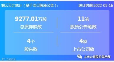 2022年5月16日,股票质押总质押股数9277.01万股,上市公司数4家,股质公告笔数11笔,股东数4个。