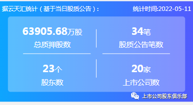2022年5月11日,股票质押总质押股数63905.68万股,上市公司数20家,股质公告笔数34笔,股东数23个。