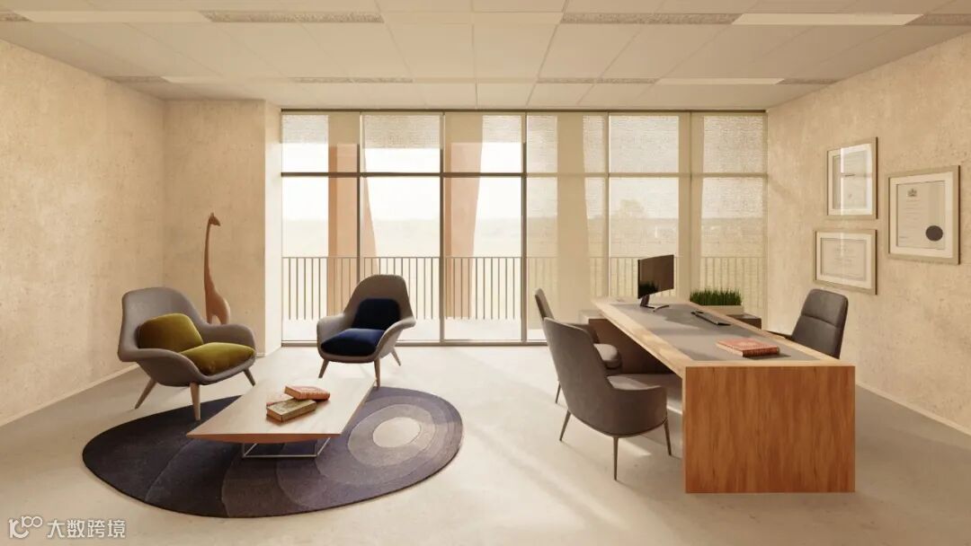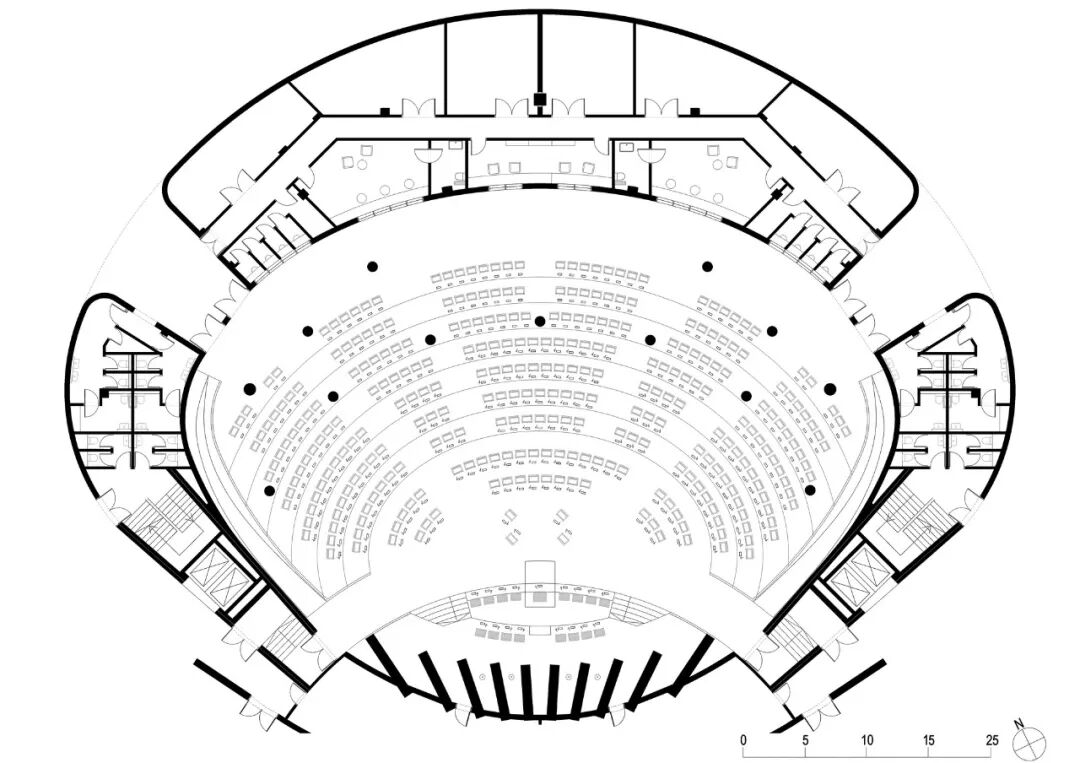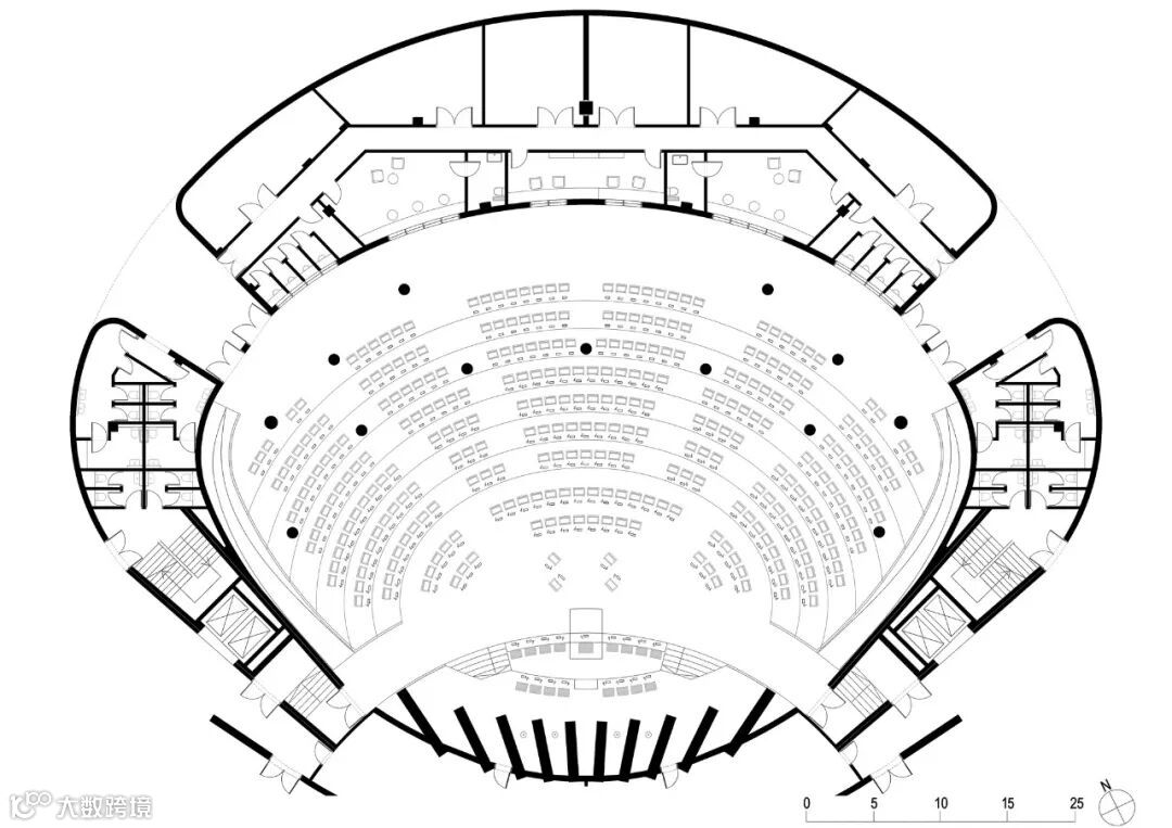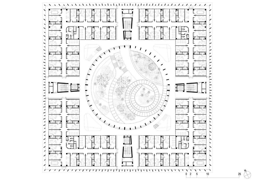 此外,建筑的中空主干设置了一个具有流通空间的中央庭院和连接一层的会议厅和上面的办公室的螺旋楼梯。