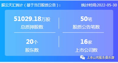 2022年5月30日,股票质押总质押股数51029.18万股,上市公司数16家,股质公告笔数50笔,股东数20个。