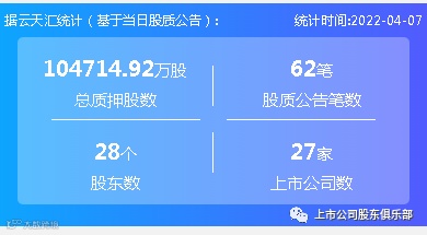 2022年4月7日,股票质押总质押股数104714.92万股,上市公司数27家,股质公告笔数62笔,股东数28个。