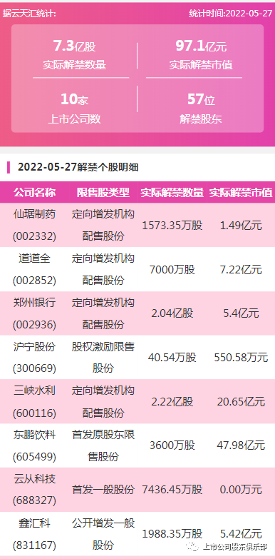 2022年5月27日,实际解禁数量7.3亿股,实际解禁市值97.1亿元,相关上市公司10家,解禁股东57位。