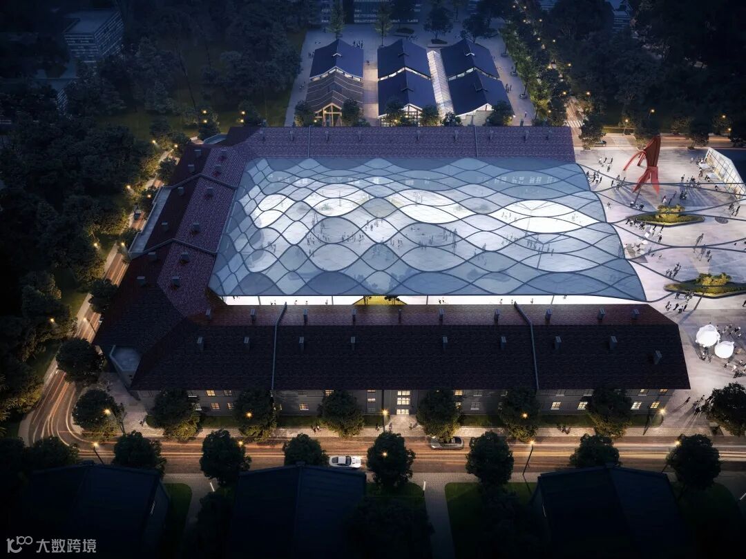 夜晚,地面的波纹状灯带连同顶部金属骨架的灯光反射,映衬出新的公共空间为基地和周边所带来的活力。