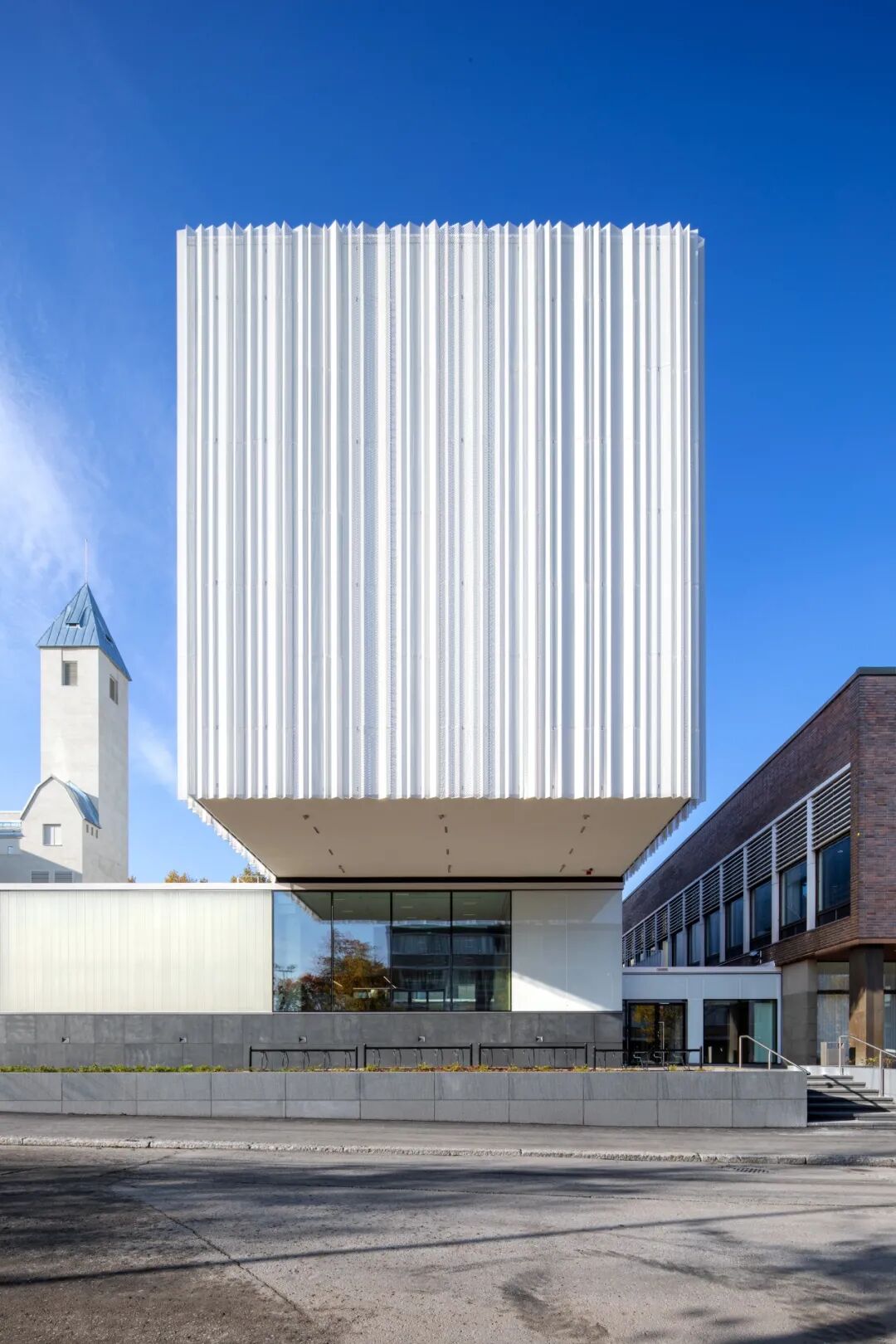 展览大楼在20世纪早期的奢华建筑和20世纪60年代的纪律性、结构化建筑之间拔地而起,坐落在这个新文化区。展览大楼的白色网状悬垂在玻璃入口层上,创造了一种现代的、轻盈的建筑印象。