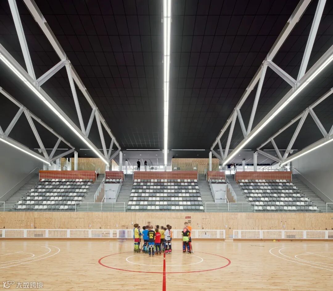 另一方面,通过大面积的玻璃开口和天窗,以及由陶瓷格子和植物品种保护的天窗,大部分地面享受到了可控的自然光,避免了阳光直射和球场上的眩光。