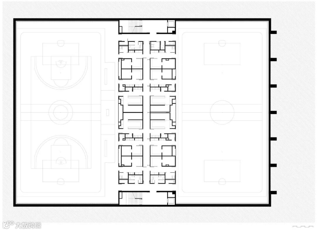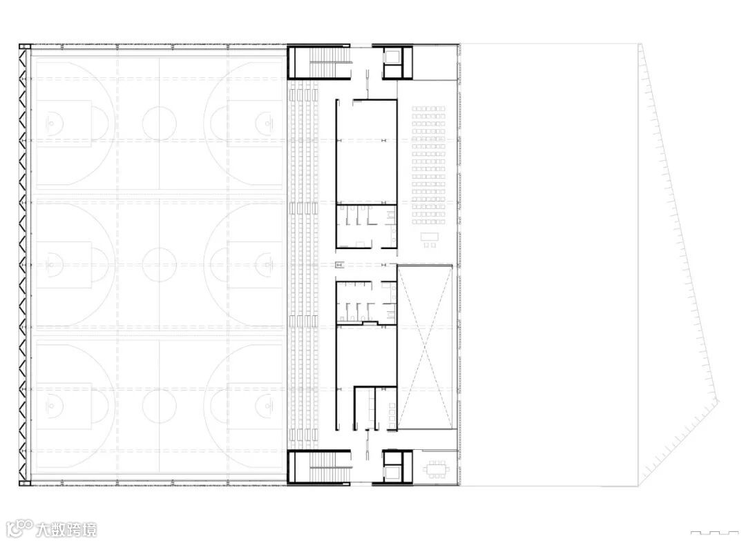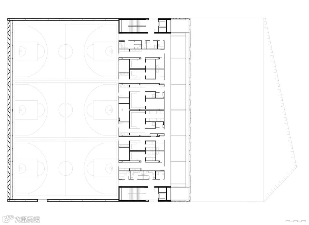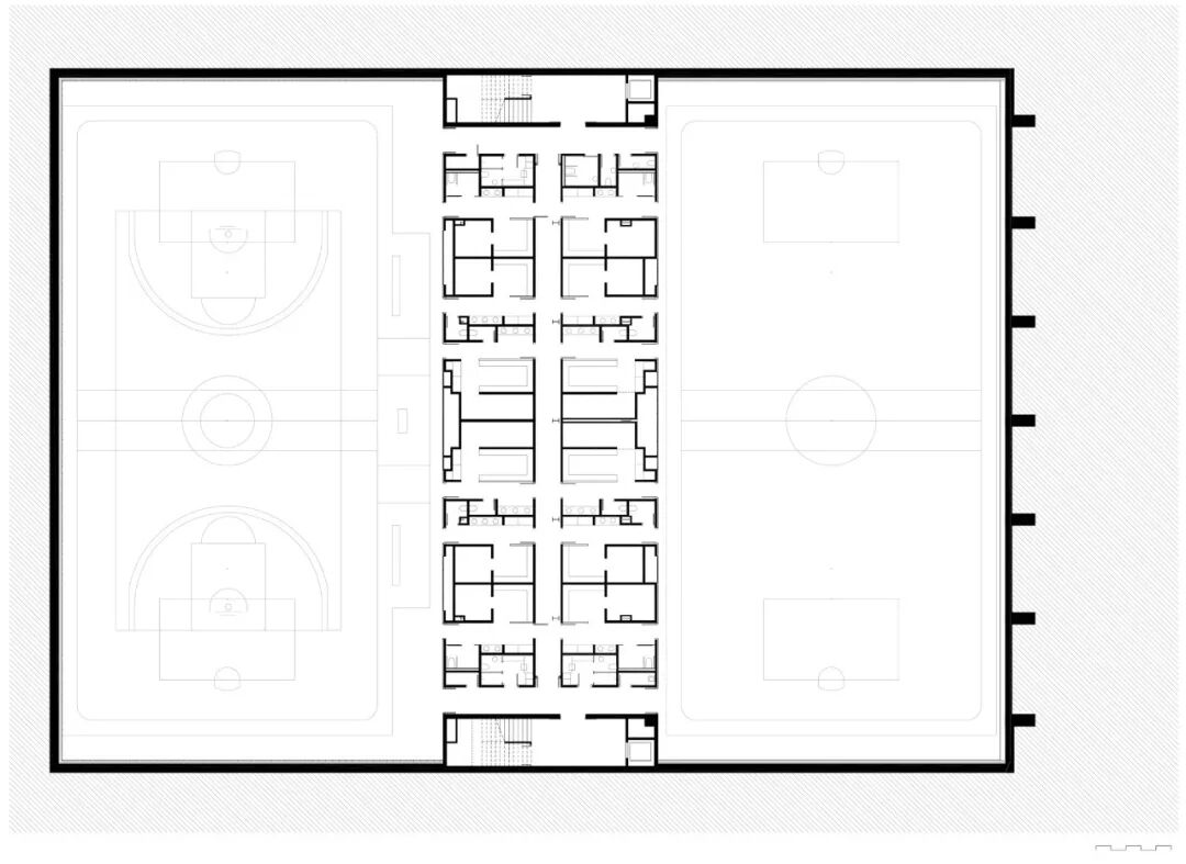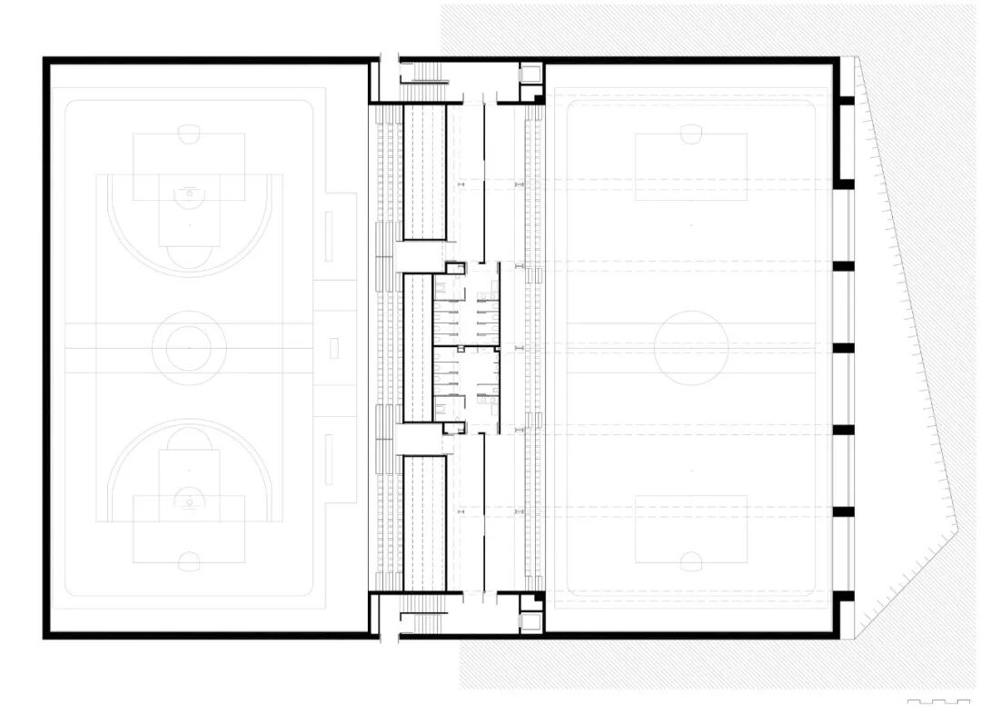 在建筑的纵向剖面和平面图中,不同区域的方案组织非常清晰,在这里不仅可以看到运动场的叠加,而且还可以看到包含较小规模方案(服务、仓库、辅助单元)、循环(垂直和水平)和设施的中央机构的安排。