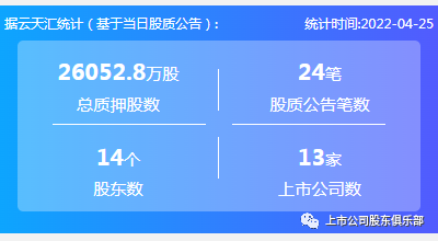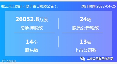 2022年4月25日,股票质押总质押股数26052.8万股,上市公司数13家,股质公告笔数24笔,股东数14个。