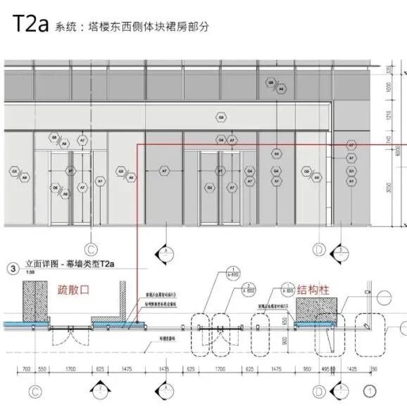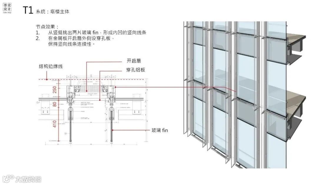 这个项目严格的计算幕墙单元的模数,主体塔楼的单元模块就两种,造型的变化通过外挂的金属肋的进深来体现,最后1400的幕墙实现的效果非常惊艳。