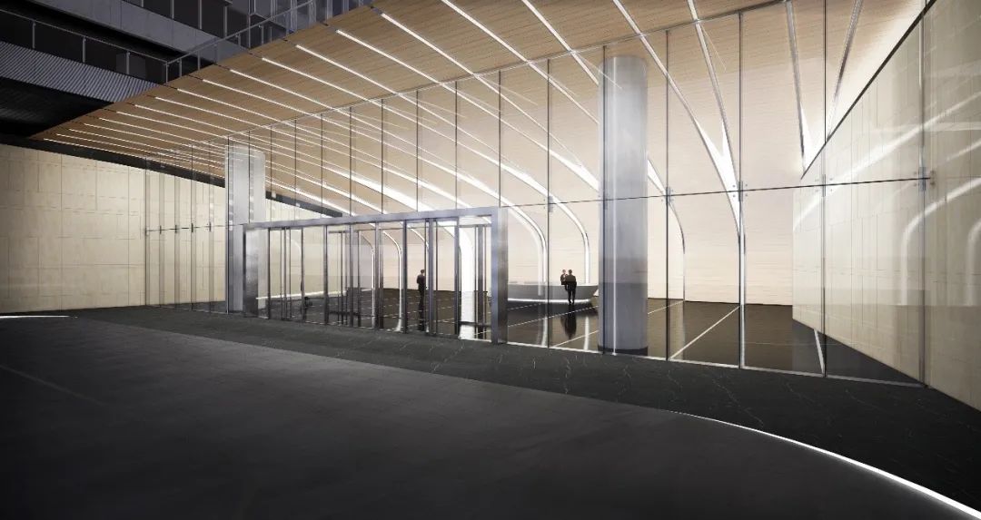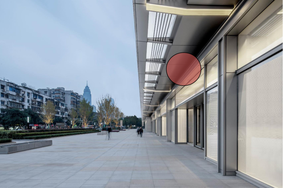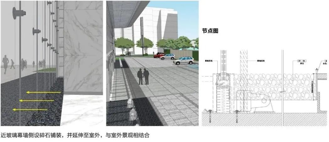 一般来说,项目最后一个收工的是景观,但是在建筑和景观交接的地方,景观的手工加工的材料要想和建筑型材的形状完全呼应几乎做不到,会留下很不平整的缝。最好的方法是用幕墙来做最后一个收工,预留一块等景观做好之后再安装,地面铺装往里面延伸一点。这样也降低了景观施工的难度。