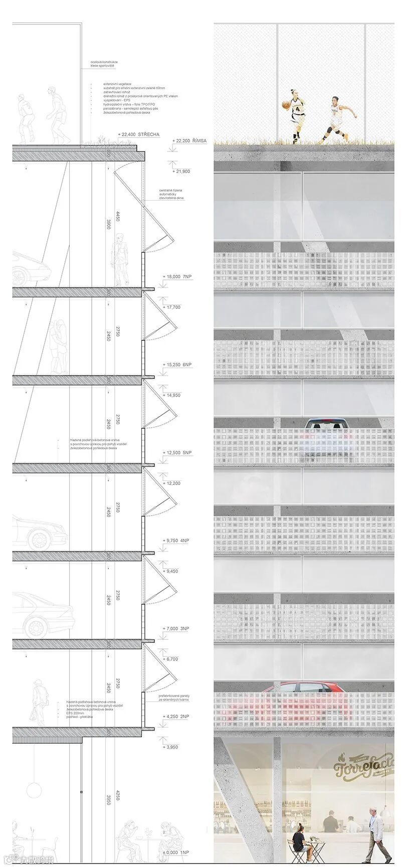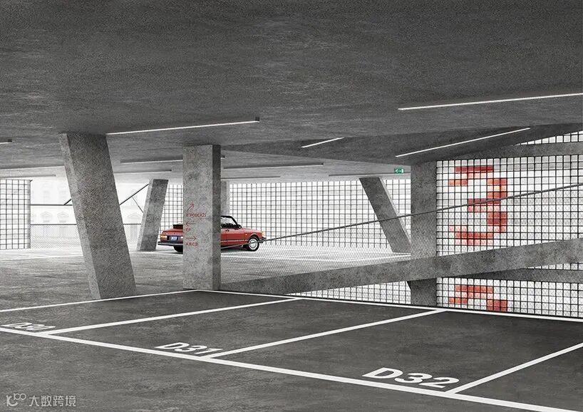半透明的立面增加了结构的视觉深度,而折叠式大窗户则穿透墙壁,以确保消防安全和自然通风。另一个重要方面是用薄的钢筋混凝土板形式的檐口对立面进行水平分隔。停车场的底楼带有租赁空间,并保持通透。