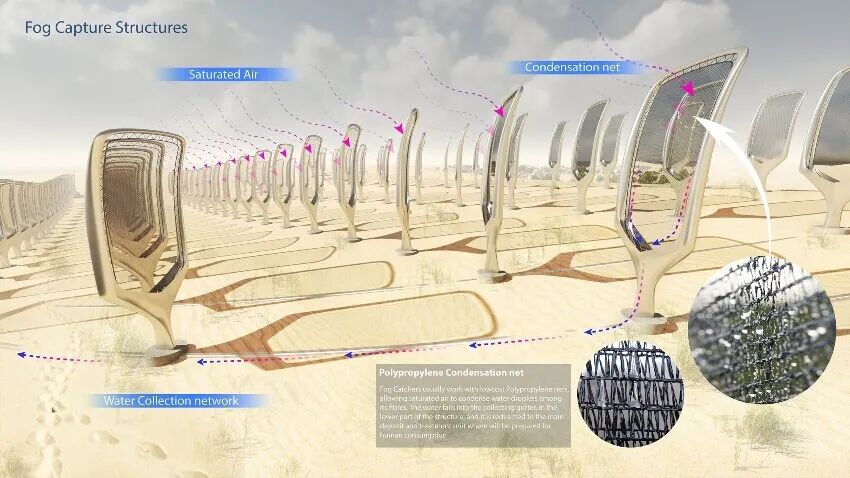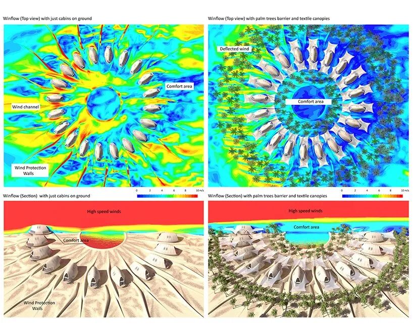 in terms of energy production, it is obtained directly from solar radiation and wind, quite abundant and constant in the new desert climate. all the cabins are fully autonomous, avoiding the need for general power grids, and their maintenance. furthermore, organic construction materials can be grown in desert locations. plants, like agave, are a source of wood and fibres, that serve as structural elements, cladding, floors, insulation, ropes, and textiles.