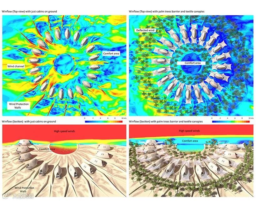"项目的重点是保护周边的生活单元的径向分布,和抗旱植物,创造一个屏障,提供庇护和舒适。"房子的空气动力学形状减少了风的摩擦,提高了稳定性,也最大限度地减少声音,振动和场地侵蚀。