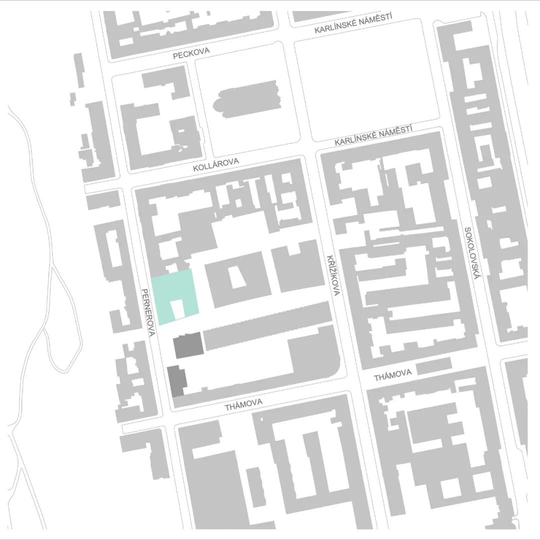 该综合大楼使Karlín的两条主要街道之间的交叉连接得以完成,并新建了一条安静的街道,该街道由建筑师Ricardo Bofill于1990年代巧妙地建立。
