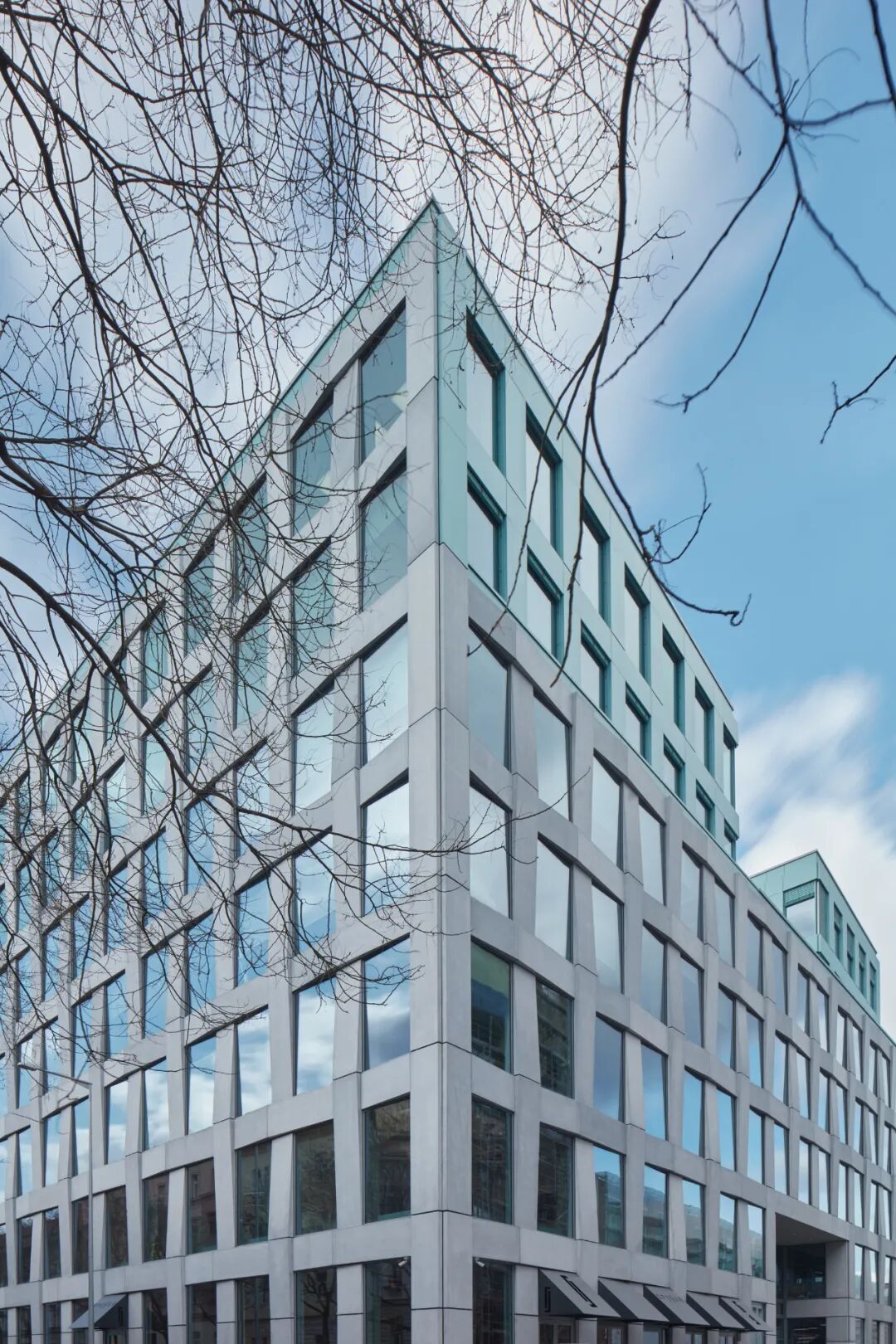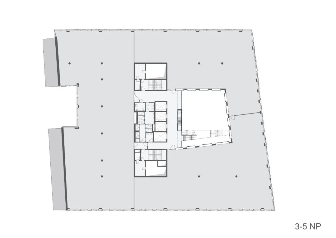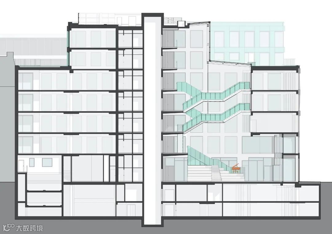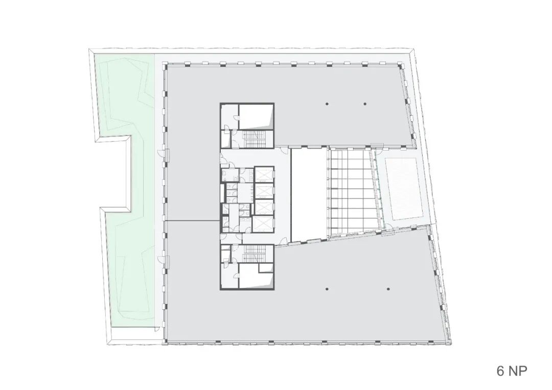 新大楼有两个地下层和七个地上层。梯形平面在建筑物东侧的上两层中退去。新公共空间东侧的主要入口是高架大厅-中庭。