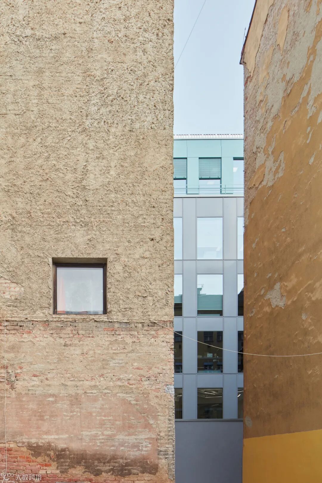 Praga工作室,我们的办公大楼,矗立在街道线上,是一个新的公共空间。附近的行政大楼在背面,还有一条新的安静街道,缓解了过大的街道街区拥堵。