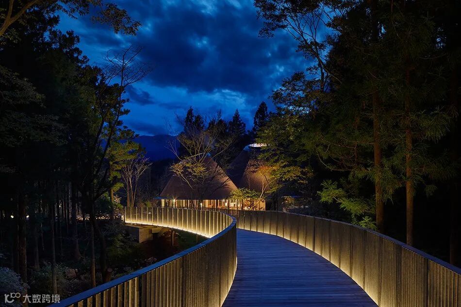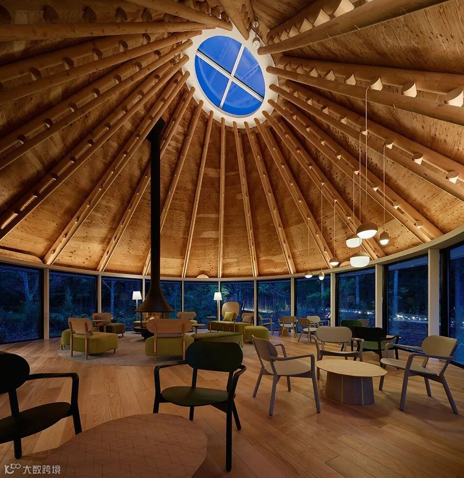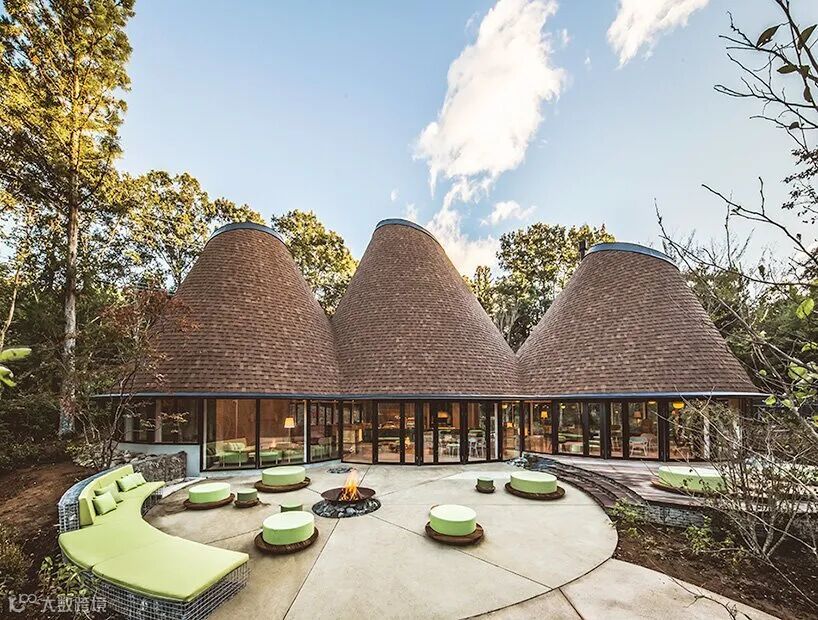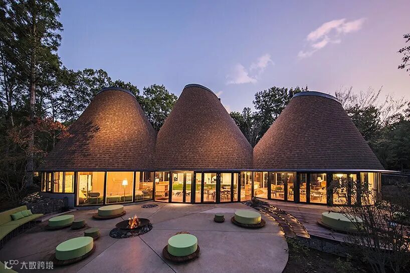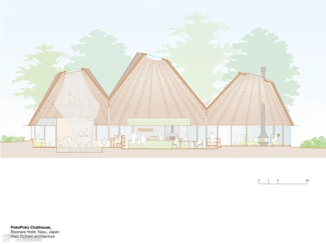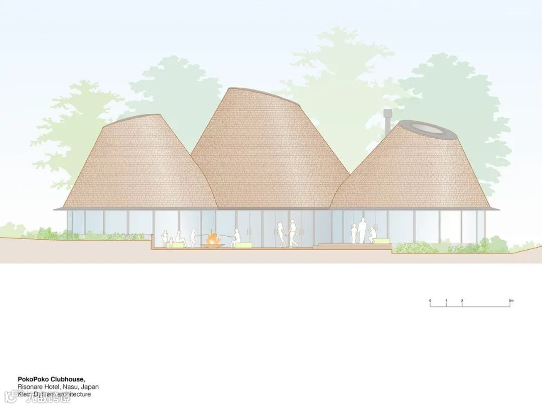 在这片森林中,Klein dytham 建筑公司的 PokoPoko 会所以其三层圆锥形屋顶出现在树线之上的不同方向。