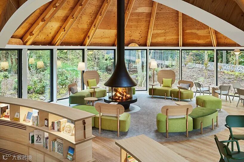 在对面,父母能够在第三个锥体的开放式壁炉周围放松。Klein dytham 建筑公司的 "Doradora "家具为客人提供了一个坐着聊天或在温暖的炉火中看书的地方。