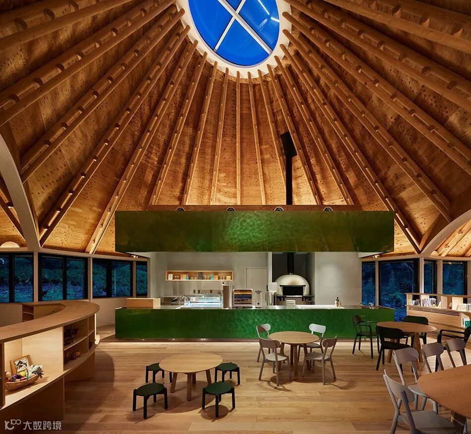 within this forest, klein dytham architecture’s PokoPoko clubhouse appears with its three coned roofs protruding in different directions above the treeline. internally, each volume has its own program. the central cone provides space for cooking activities based on the fresh ingredients grown on the hotel’s own grounds. the space hosts a variety of food-related workshops for children and parents, while a wood-log oven lets guests make their own pizzas with vegetables and herbs picked from the nearby fields.